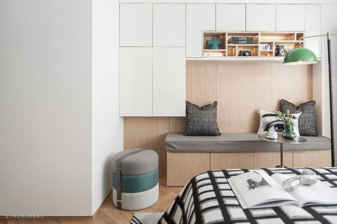 ▲床尾装上卡座+吊柜组合,也提供了一个情趣而实用的收纳与休闲角落。