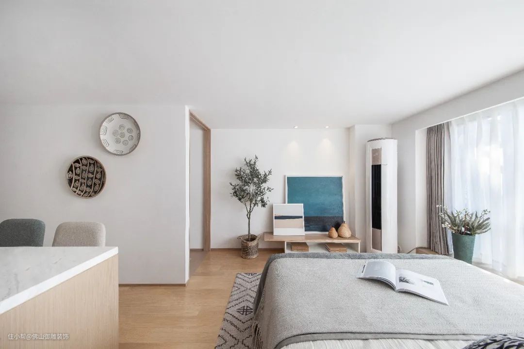 ▲床尾位置布置一个小矮柜+空调柜机,布置绿植与装饰画,而在餐桌后的空墙上也是挂了两个圆形的装饰,让这个公寓空间充满简雅温馨的文艺气息。