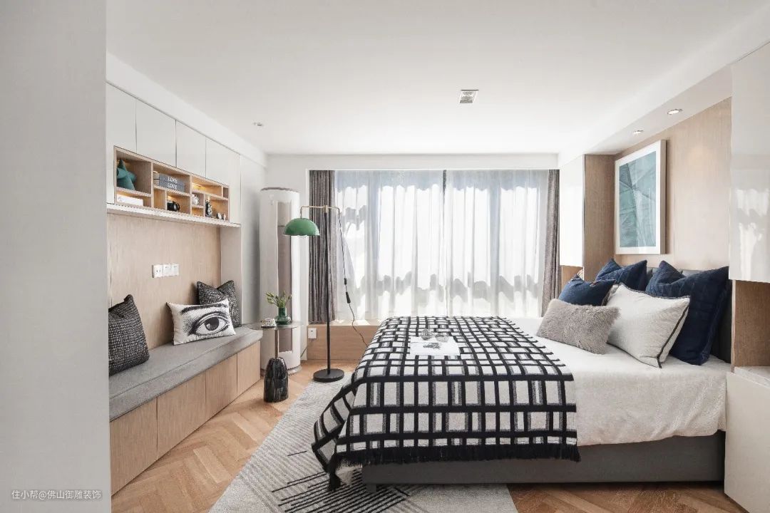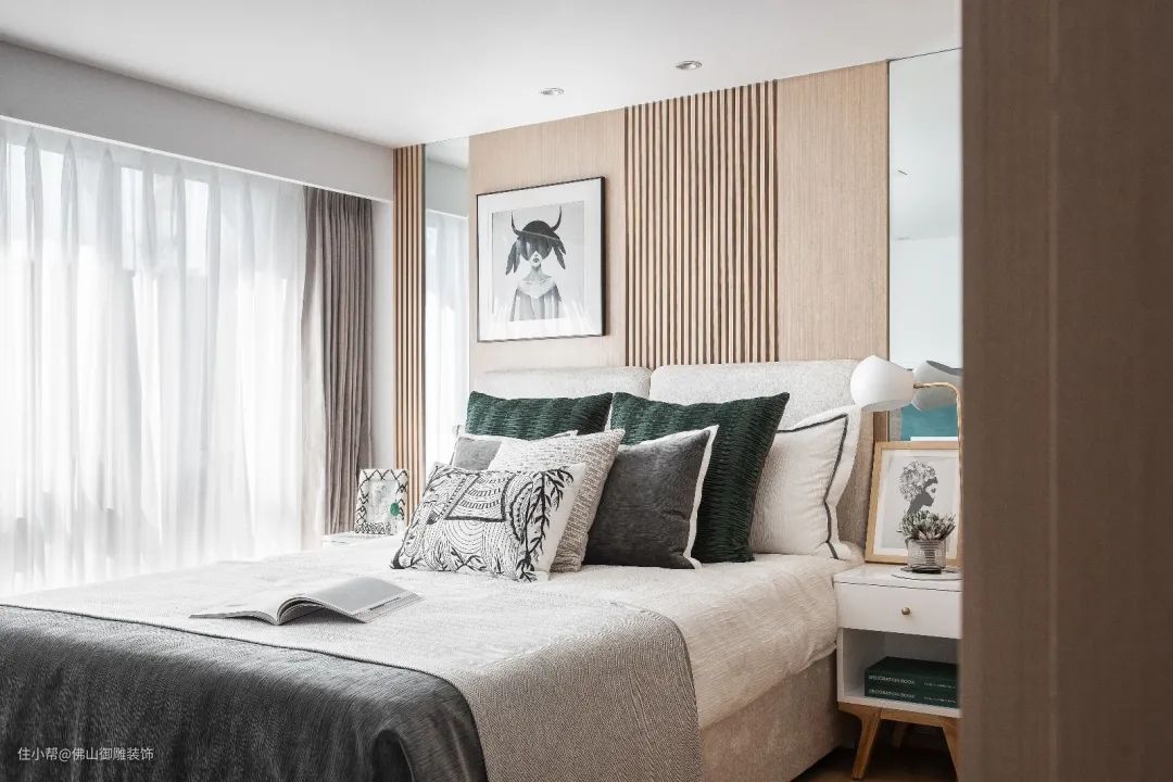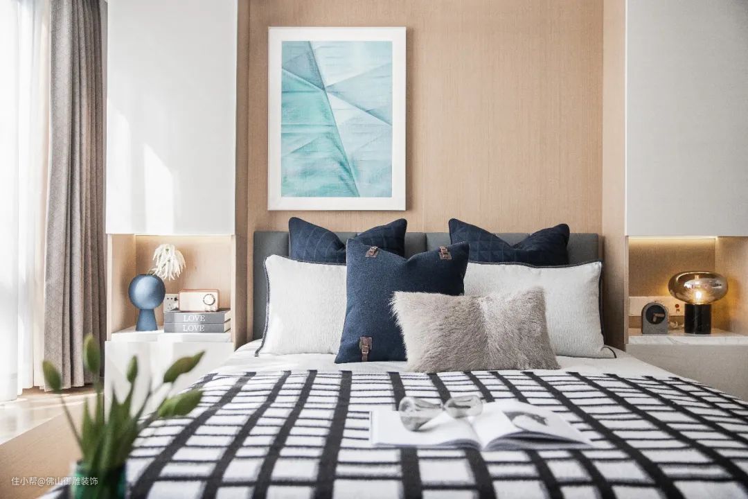 ▲木饰面的床头墙上,挂上一幅黑白装饰画,床上布置朴素的床单、枕头,床侧边布置一个简约优雅的床头柜,整个卧室都显得格外的温馨舒适。
