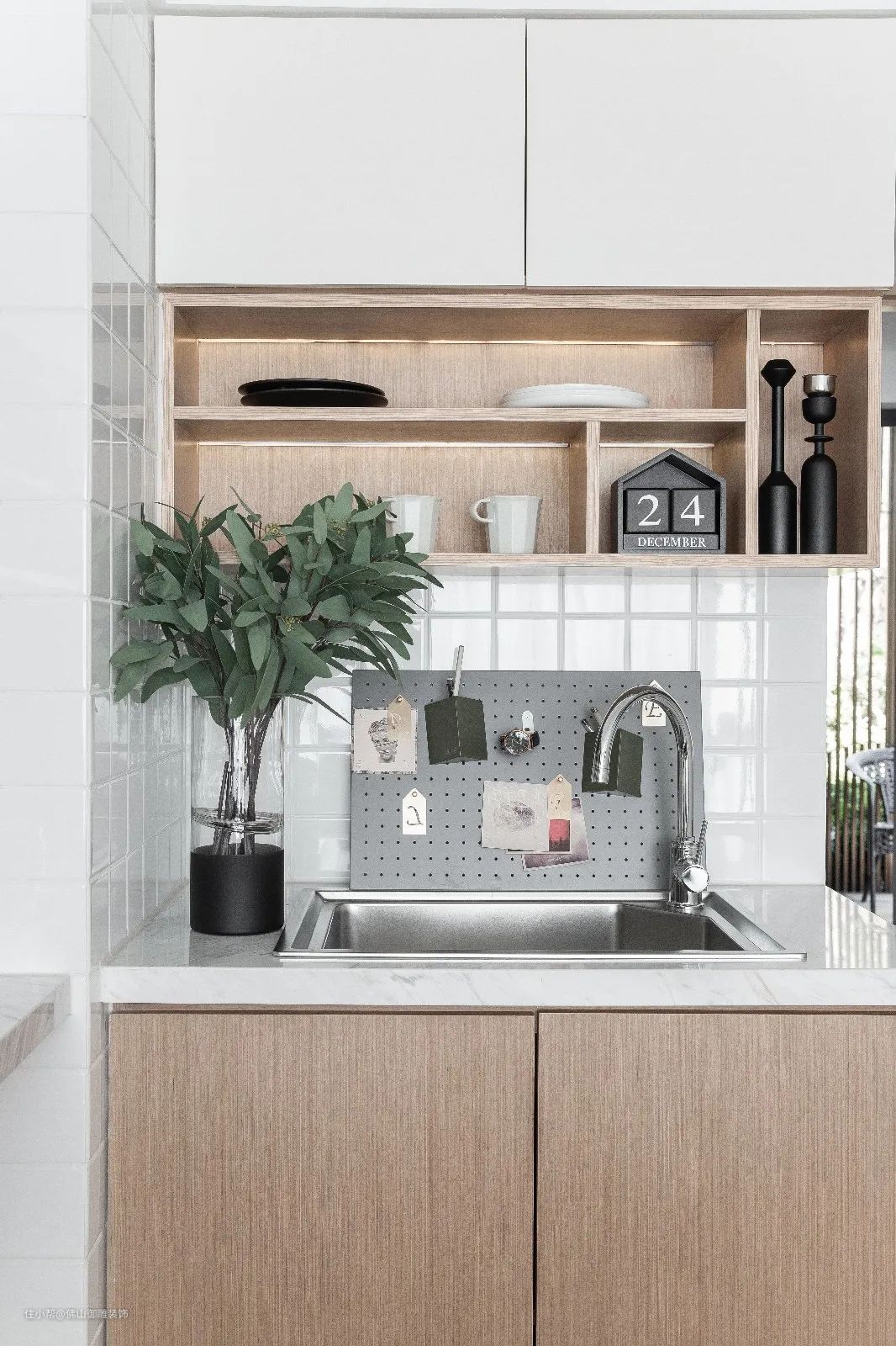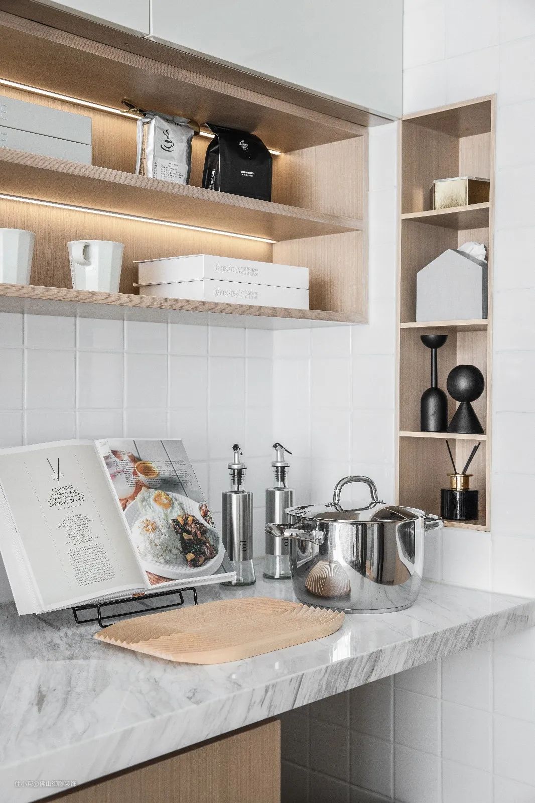 ▲操作台上方的吊柜加入实用的开放格,常用的用品可以放在上边,取用更加方便。