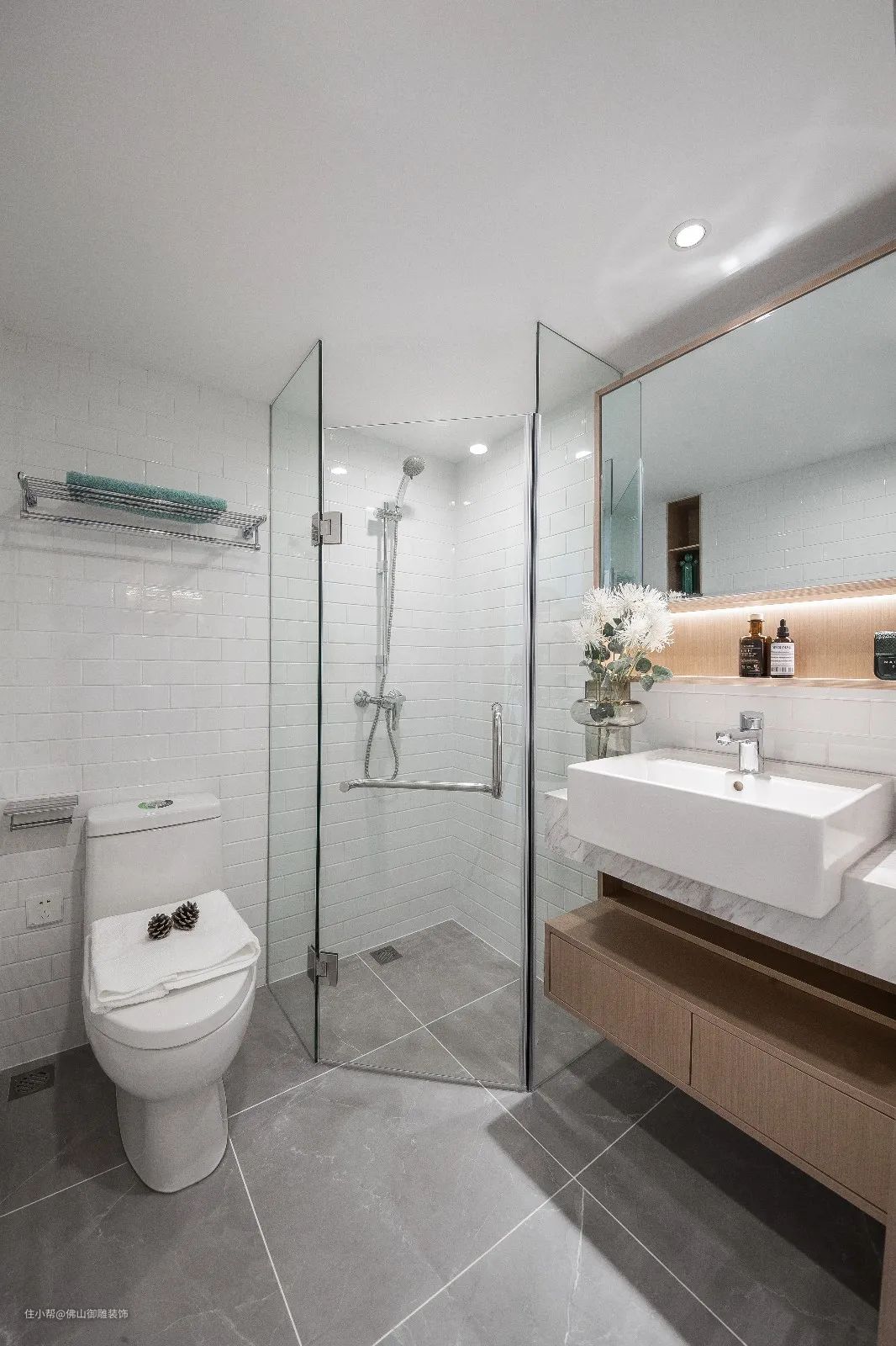 ▲卫生间以灰色的地砖,墙面铺上白色面包砖,钻石型的淋浴房两侧布置马桶与洗手盆,台上盆的下方也加入了木质的浴室柜,整个卫浴空间显得文艺舒适而实用。