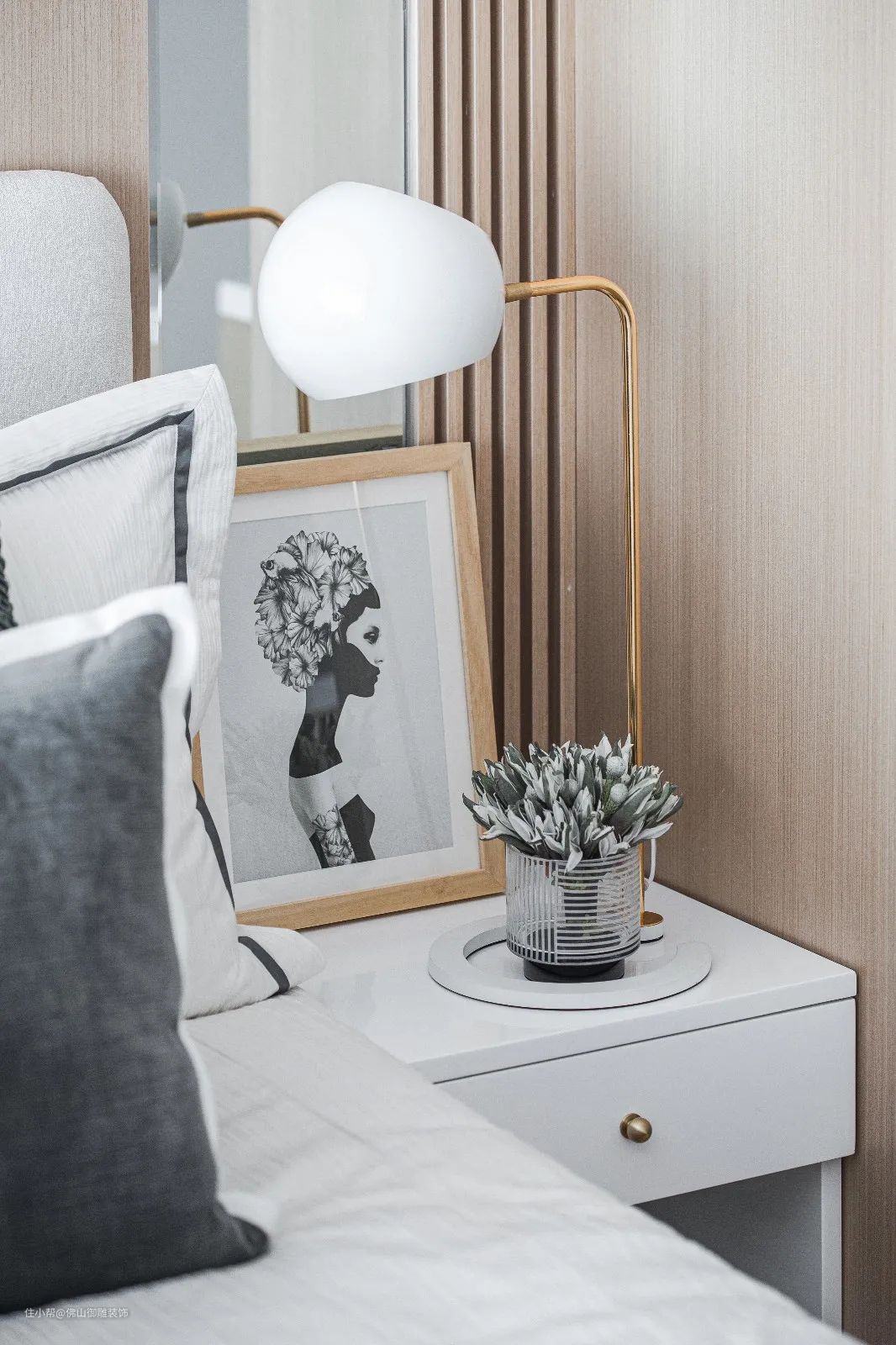 ▲床头柜上布置花瓶、台灯与装饰画,旁边墙面是长城板与木饰面的材质,整个空间质感现代优雅而高端。