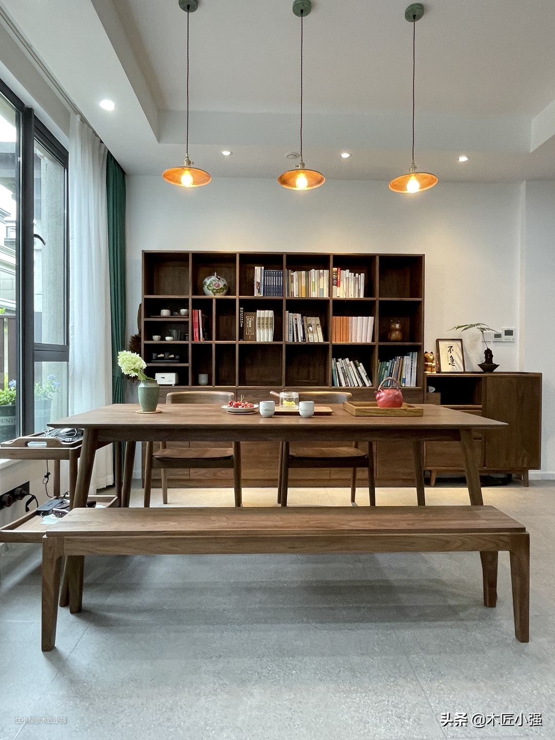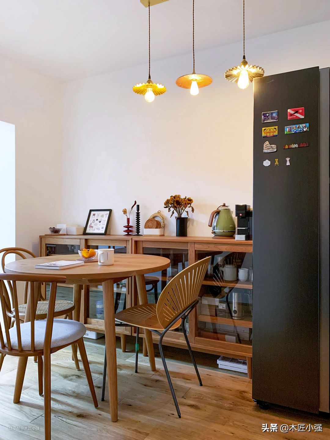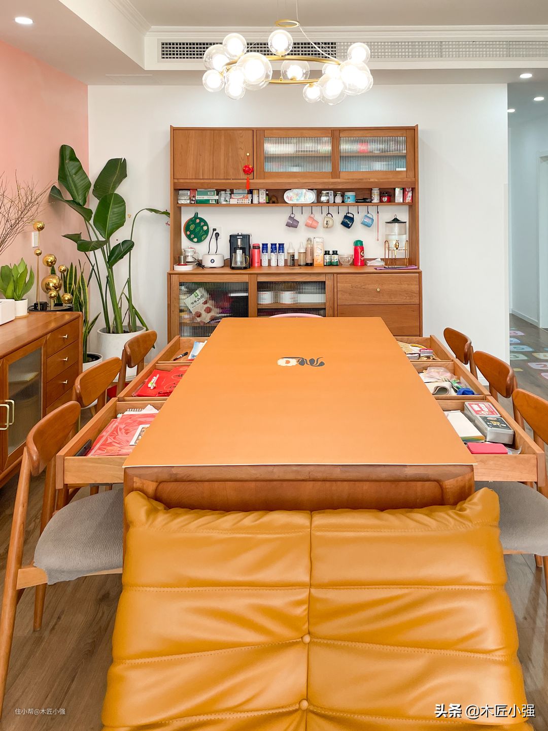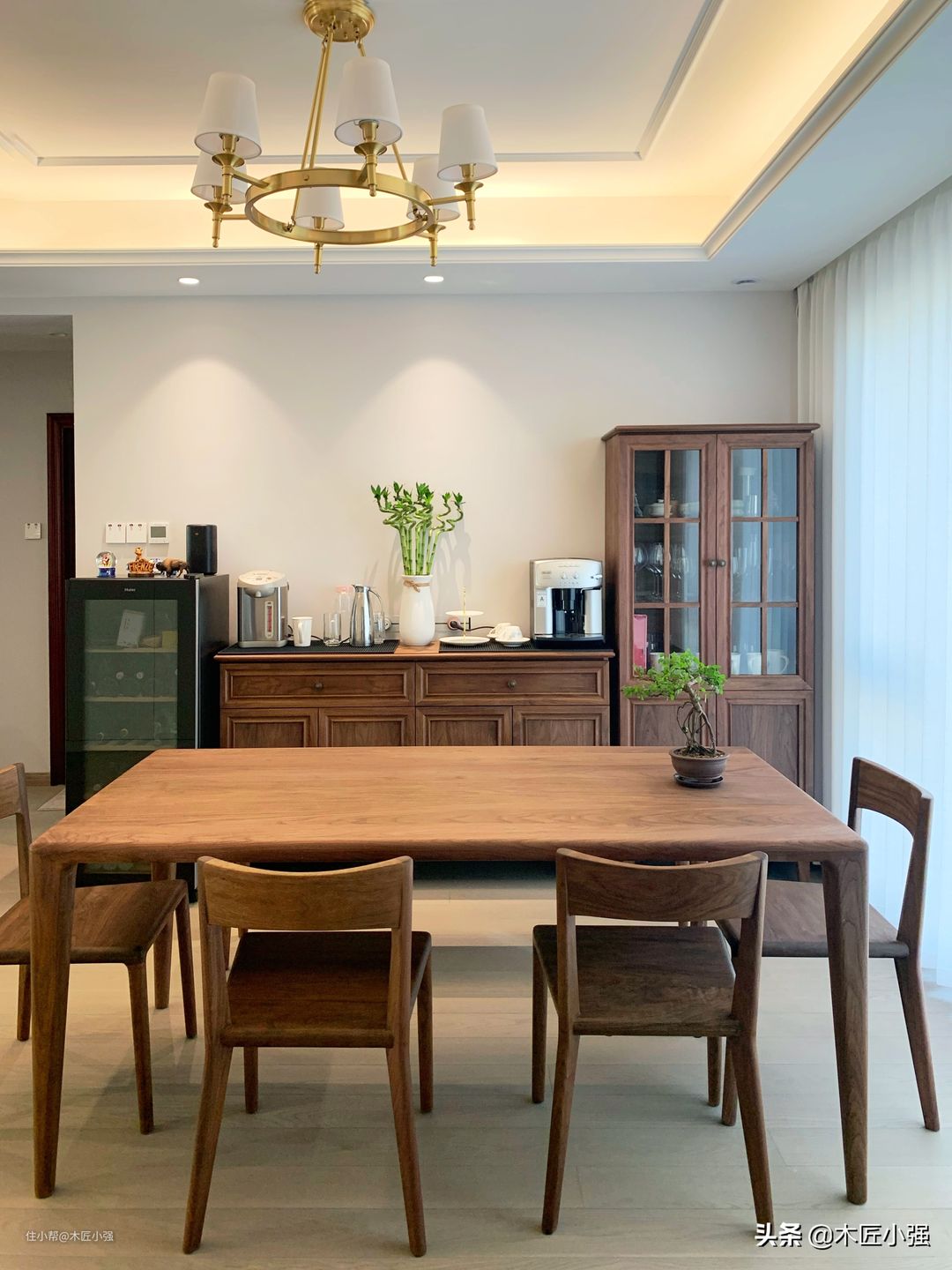 当然,对于有可能经常接触水和油污的家具,比如餐桌、餐边柜,尽量做好防护,因为木蜡油表面耐高温、油污和防水性能相对油漆家具弱。下面的图为了拍照好看去掉了防护,平时使用,还是需要铺个桌布或者玻璃的。
