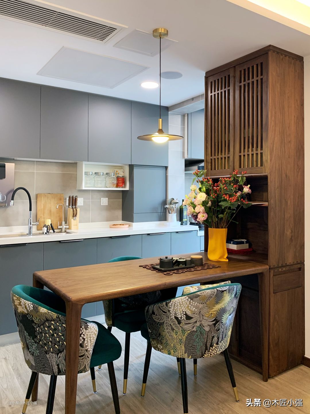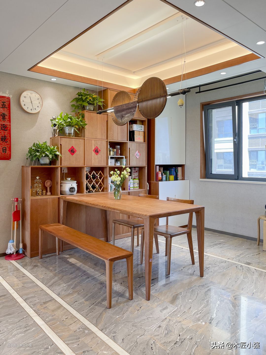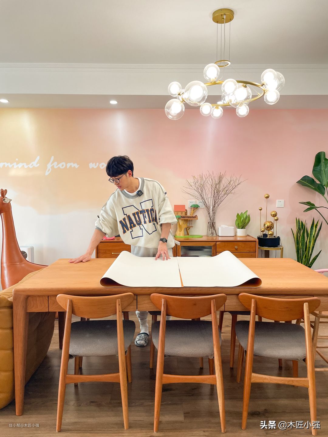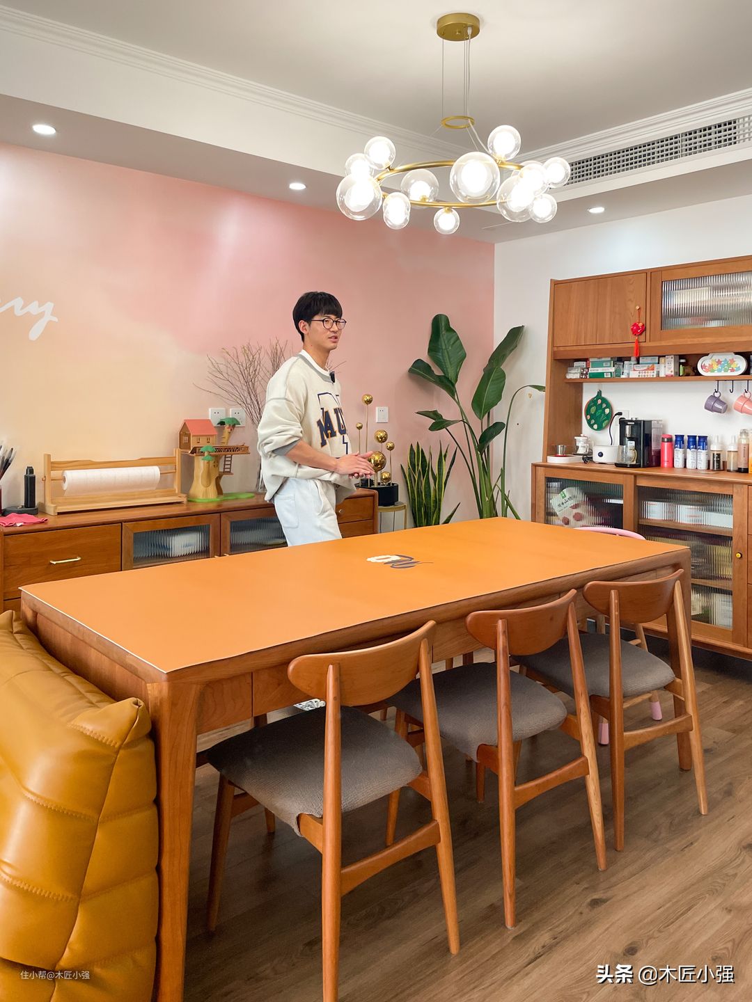 当然,对于有可能经常接触水和油污的家具,比如餐桌、餐边柜,尽量做好防护,因为木蜡油表面耐高温、油污和防水性能相对油漆家具弱。下面的图为了拍照好看去掉了防护,平时使用,还是需要铺个桌布或者玻璃的。