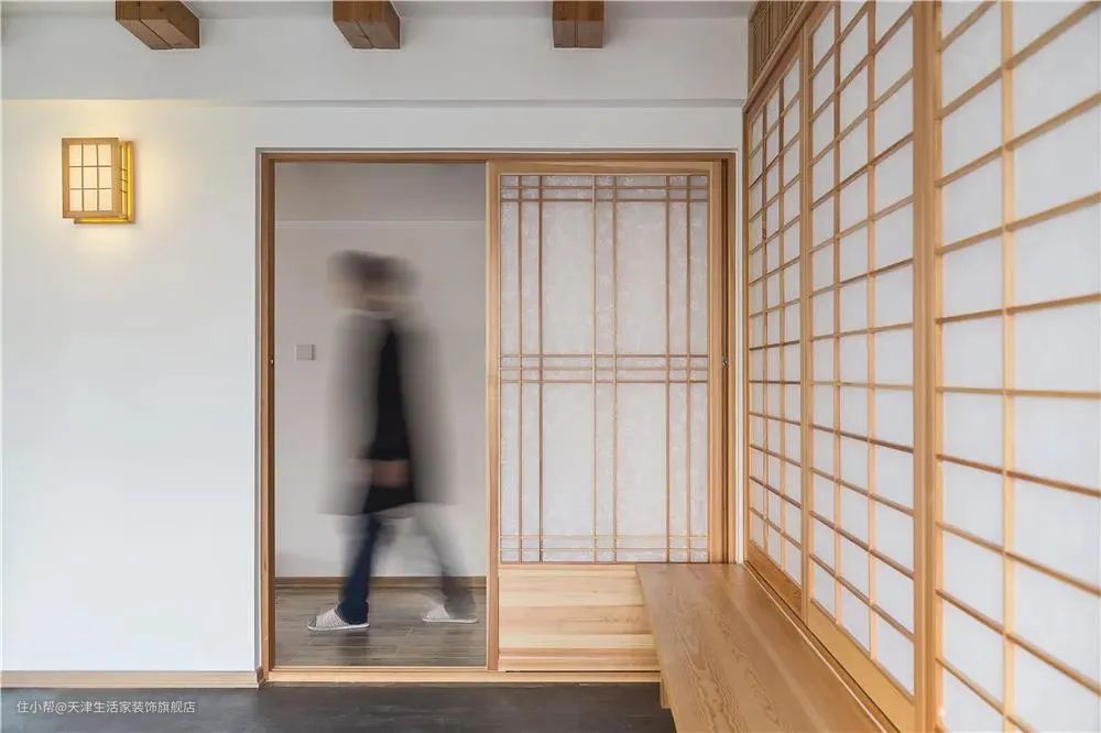 日式格子拉门的设计使空间看起来更加通透,又不失隐秘性。格子门的几何造型本身也成为空间中一个重要的装饰。