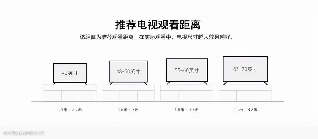 简单如宝来说,只要眼睛能接受屏幕真的是越大也好。相对于画质提升的变化,大尺寸震撼感带来的体验会更加明显。不是追求极致画质体验的小伙伴,二狗建议尽量选择自己能接受的最大尺寸电视。要是不知道多大尺寸合适,建议测量好自家预计放电视位置和观看位置直接的距离,去大卖场试试就清楚啦。对绝大多数人来说,大真的就是王道。虽然我也说了尺寸参照意义不大,但是还是有一个相对的参考数据可以给大家看下。统一尺寸,建议最好对应其推荐的推荐距离的下限,这样选择的电视观看会更加合理。