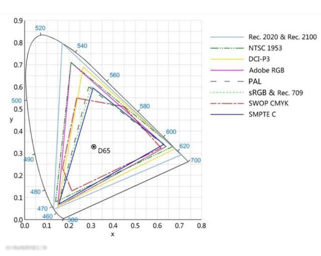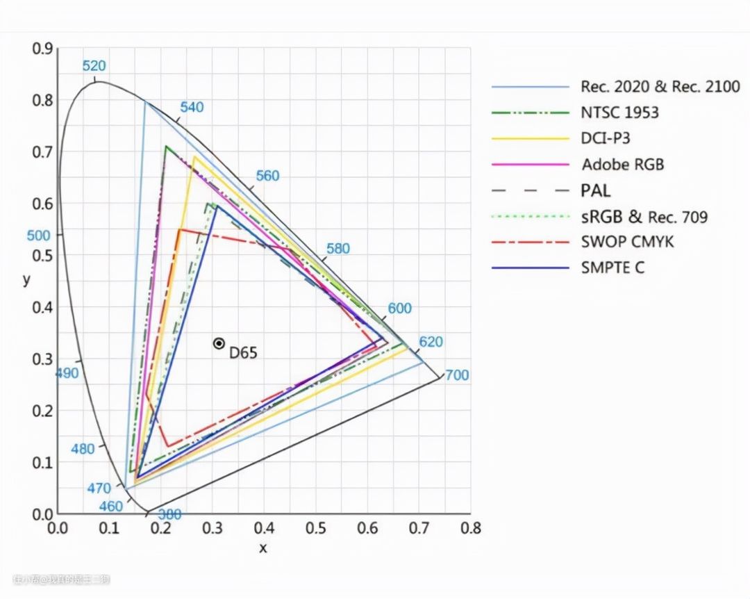 色彩表现由多个因素决定,日常主要考虑色域表现、色准、色深三个维度,一般来说主要了解色域即可。一般来说色域越广越好,广色域包含更多的色彩表现,能够更好的呈现视频的画质。色域范围标准由于没有统一的标准,不同标准下的色域范围有较大差异。色域标准众多常用的主要包括NTSC、sRGB、BT.709、BT.2020和DCI-P3几种,不同标准覆盖的色域范围不同。考虑到NTSC作为计算标准相对通用,习惯性会将其他色域标准转化成NTSC(考虑到不同色域之间并不能完全互相覆盖,这里的转换只是近似)。了解色域的时候一定要清楚电视机厂家使用的是哪一种标准来衡量,对画质要求较高的话尽量选择广色域电视机(以NTSC标准为例,一般色域超过82% NTSC我们就可以称其为广色域电视)。