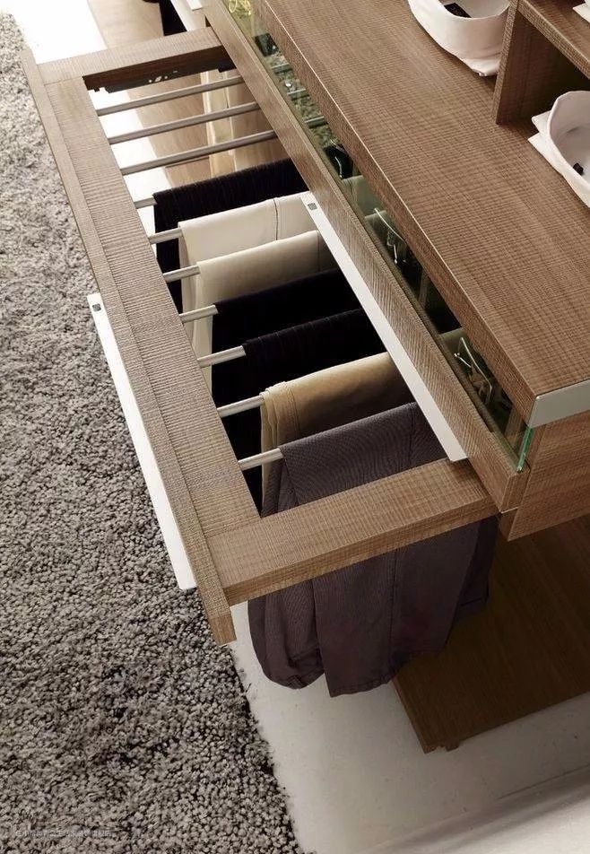 另外,如果你是一个非常注重细节的人,还可以增设领带架或升降衣杆,把所有关于折痕的顾虑都排除在外,为自己的衣帽间再添亮点。