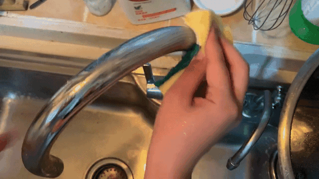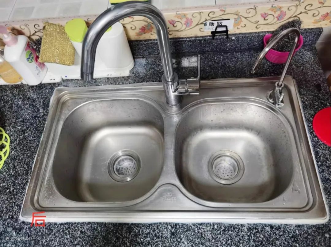 下水槽最难打理的就是水龙头了,弯度多,不锈钢的很容易沾上污渍,加上长期走水,周边还有水垢。
