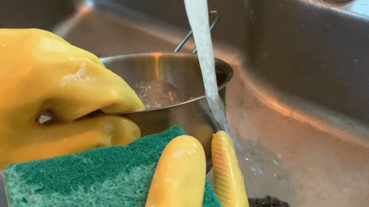 TIPS:没有洗碗机的也不要担心,将顶盖、接油盒、过滤网格架全放一个巨大的洗碗塑料盆里,加入90度的高温热水侵泡15-30min,有同样的效果。