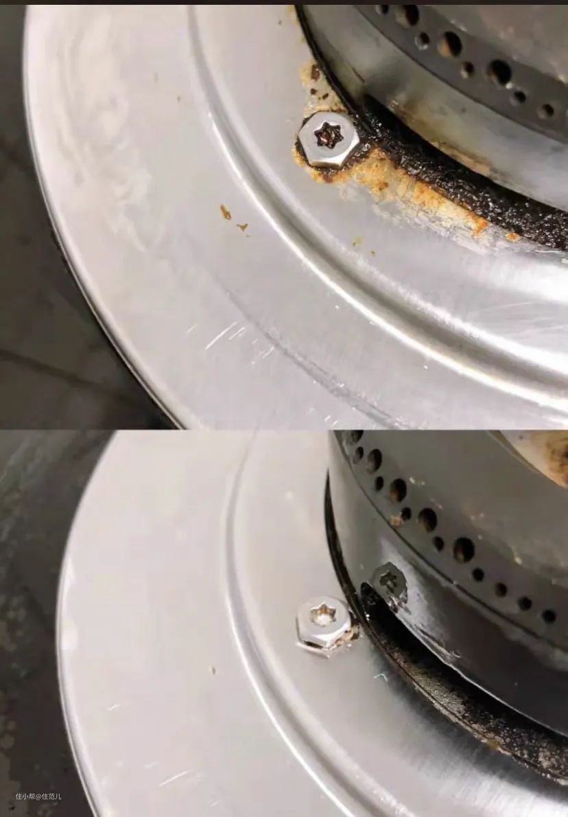 但灶台的油更顽固,和灶台表面的不锈钢紧紧粘结在一起,呈均匀状发布。