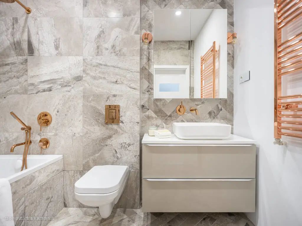 比如,瓷砖可以使用稍浅一些的来扩大一定的空间感,然后美缝的颜色也可以用相近的、不突兀的颜色来作为搭配,比如白、浅金等。