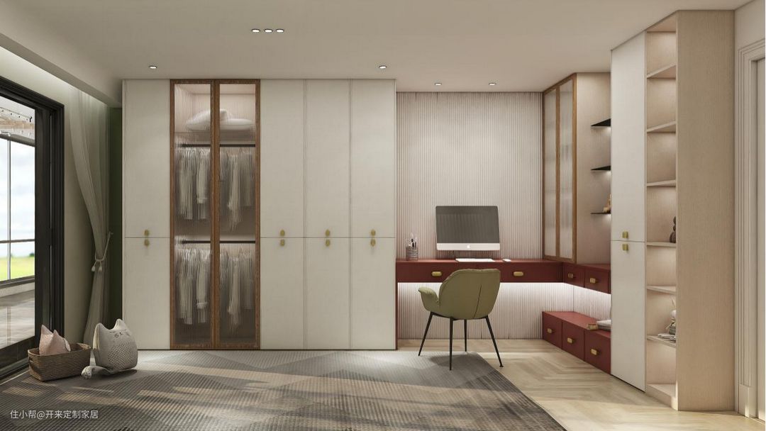 3、营造雅致低调的氛围。高大的书柜结合玻璃柜,延伸L型书桌,开架设计丰富层次,也适合收纳常用品。衣柜采用玻璃门,一览无余,减少翻箱倒柜的忙乱。(图3-4)