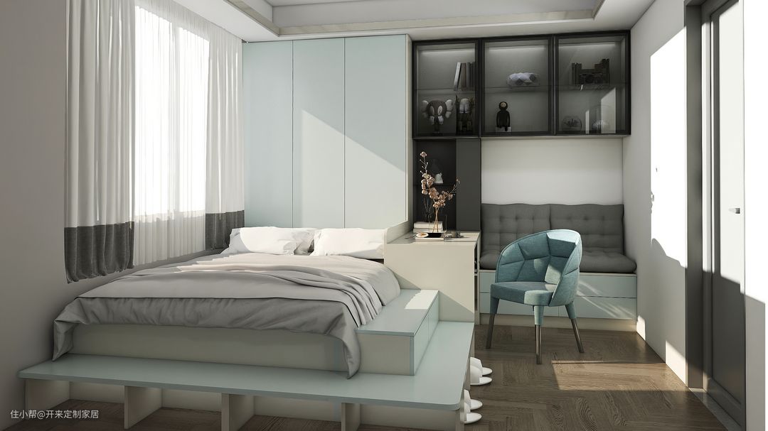 1、要自然舒适。以极简的线条、舒适的布局,打造小空间的大格局。榻榻米设计床头衣柜、玻璃书柜、卡座、书桌一体式。(图1)