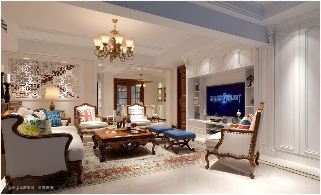 家具方面在传统美式家具上进行改良,采用布艺等材质,变的线条简洁,不再那么高大,再与轻奢风格元素中常见的黄铜搭配,把轻奢的精致质感体现的淋漓尽致。
