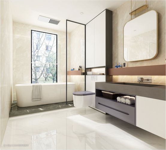 黄棕色墙面搭配白色地砖形成空间层次感。