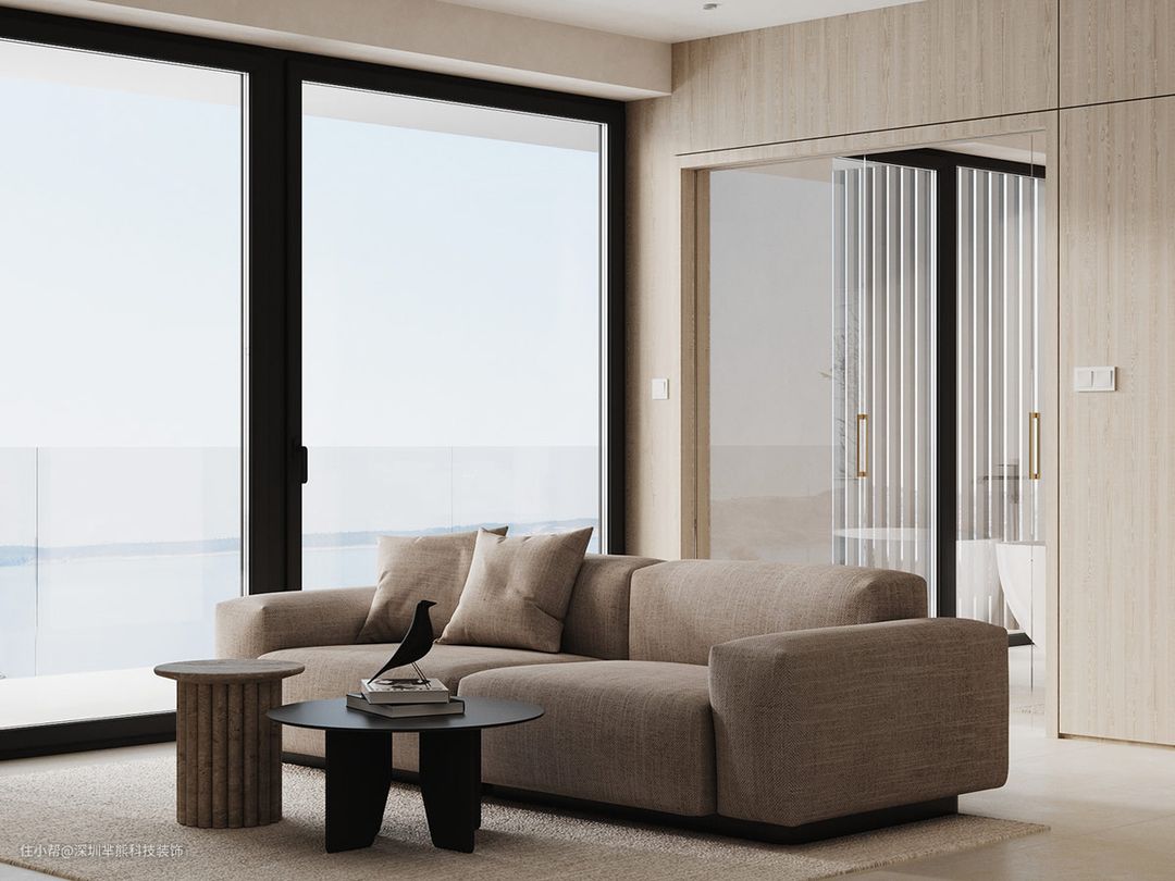在小沙发线程通过休息室的中心一个温暖的灰褐色口音。沙发位于现代木镶板墙和玻璃墙卧室前,为生活空间带来额外的阳光。