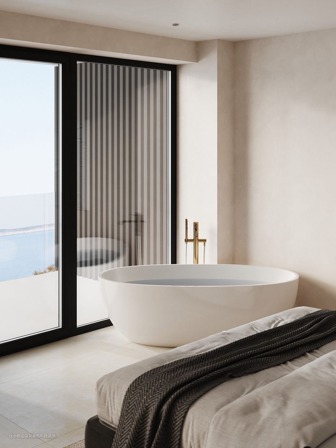 独立式浴缸矗立在床脚,营造出奢华的氛围。