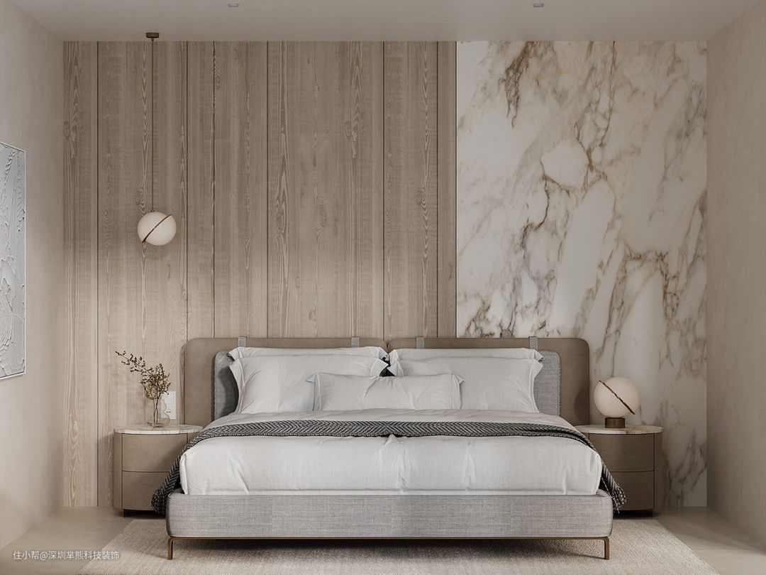 大理石桌面提升了低调的床头柜。