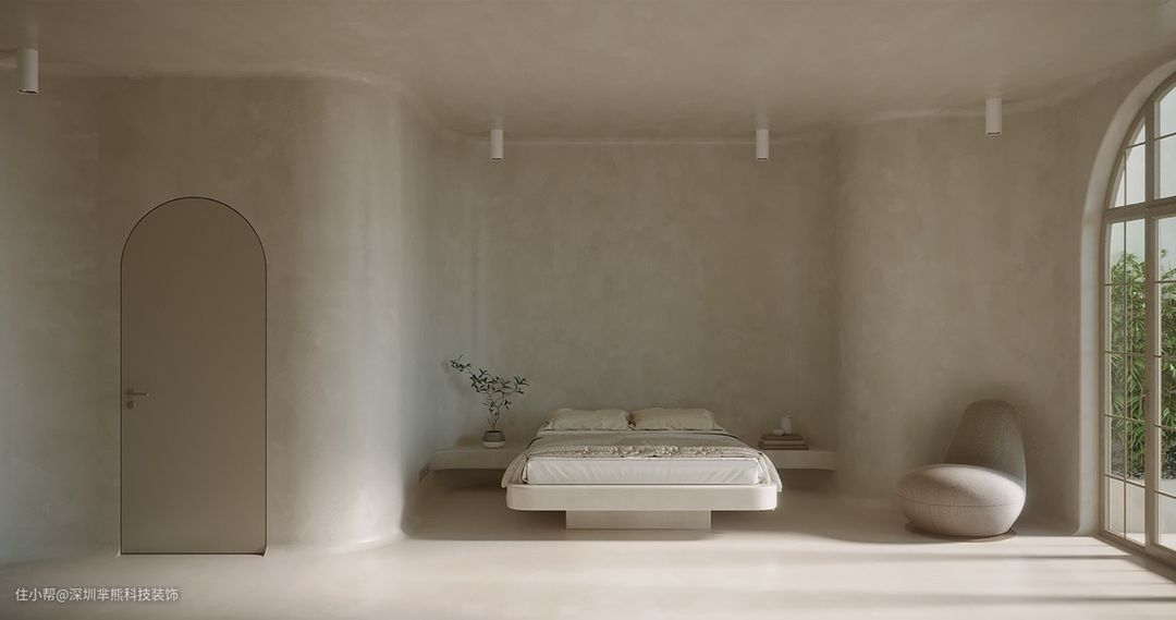 轻盈简洁。微水泥天花板融入协调的墙壁,淹没在地板和匹配的床边,塑造出一种连续、平静的融合。