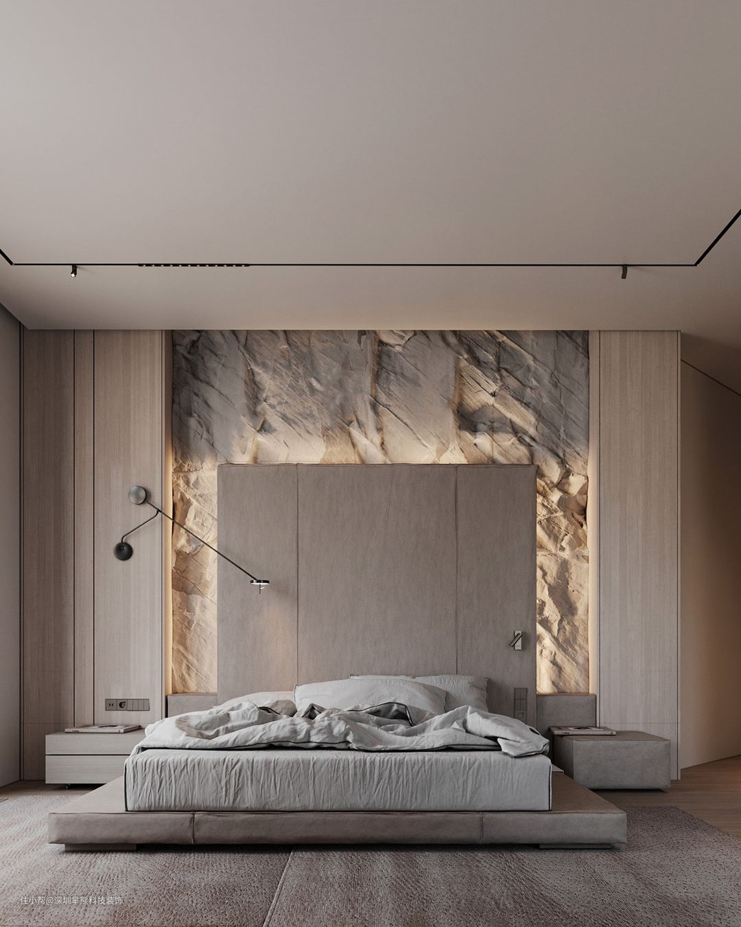另一个引人注目的岩面特色墙与这种光滑的卧室装饰方案形成鲜明对比,木质效果板覆盖了现代空间的其余部分,匹配的米色内饰包裹着地床。