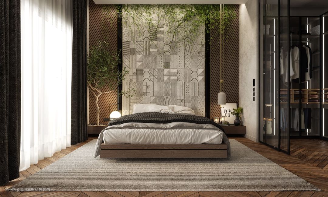 大自然与现代主义的融合。这种植物亲吻卧室设计的特点是从地板到天花板的床头板,带有 3D 现代抽象瓷砖和攀爬常春藤。