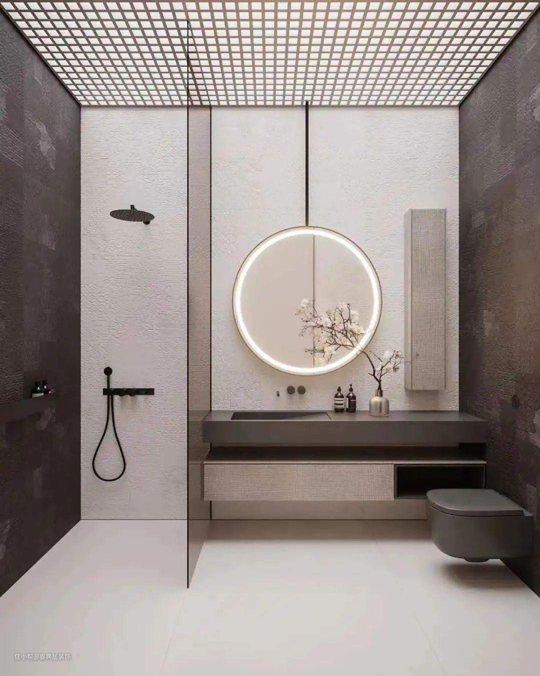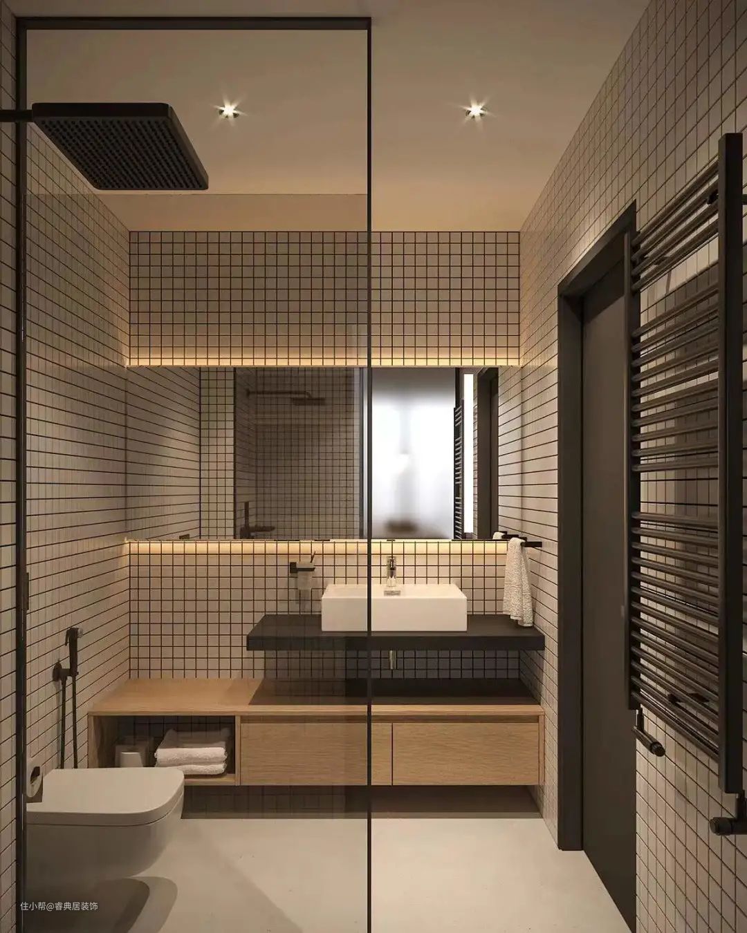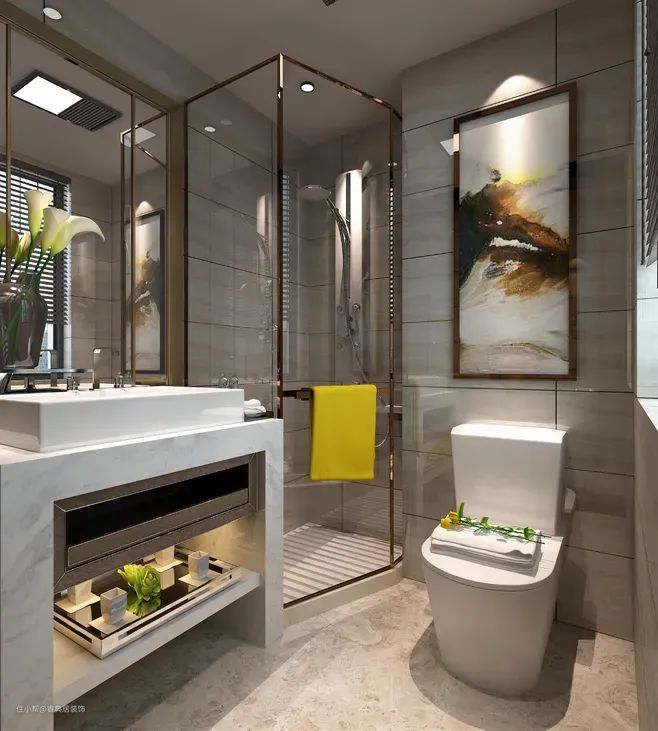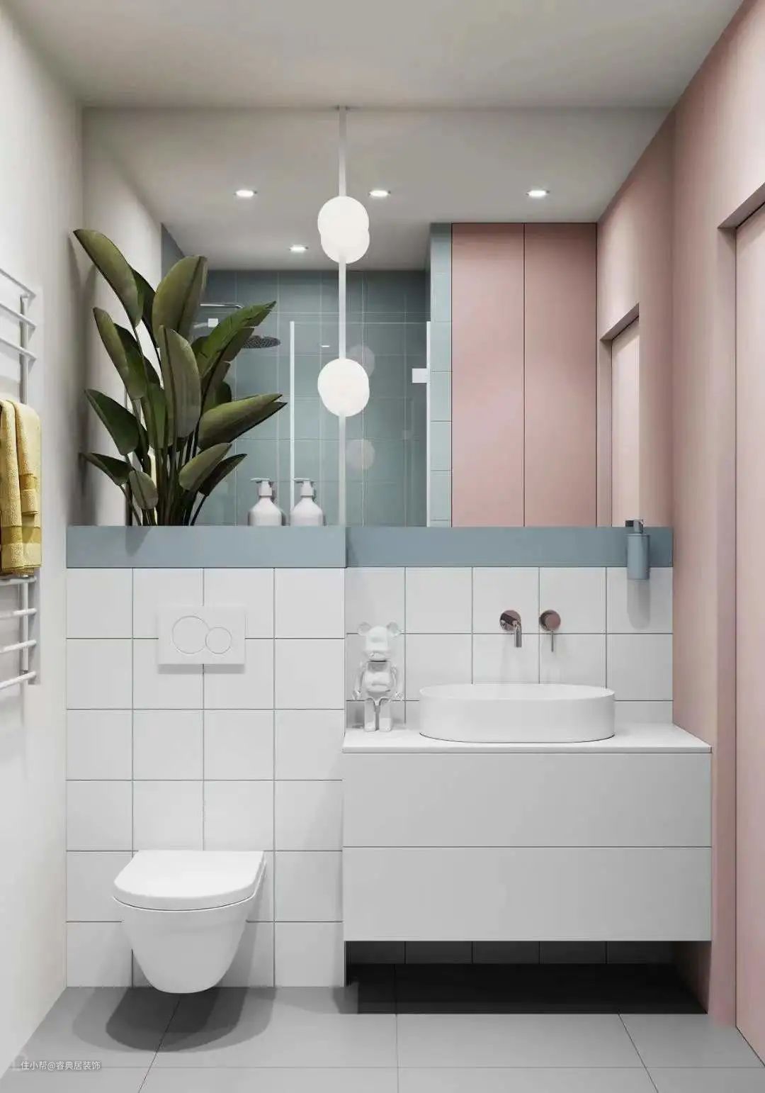 卫生间更注重的是实用性,在满足实用性的基础上进行一些个性化的搭配,一般以简洁大气为主,色彩和种类不要超过3种,反之会引起视觉上的审美疲劳,破坏这种色彩间的有机平衡。