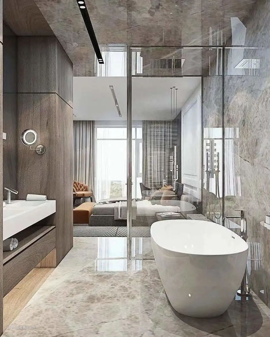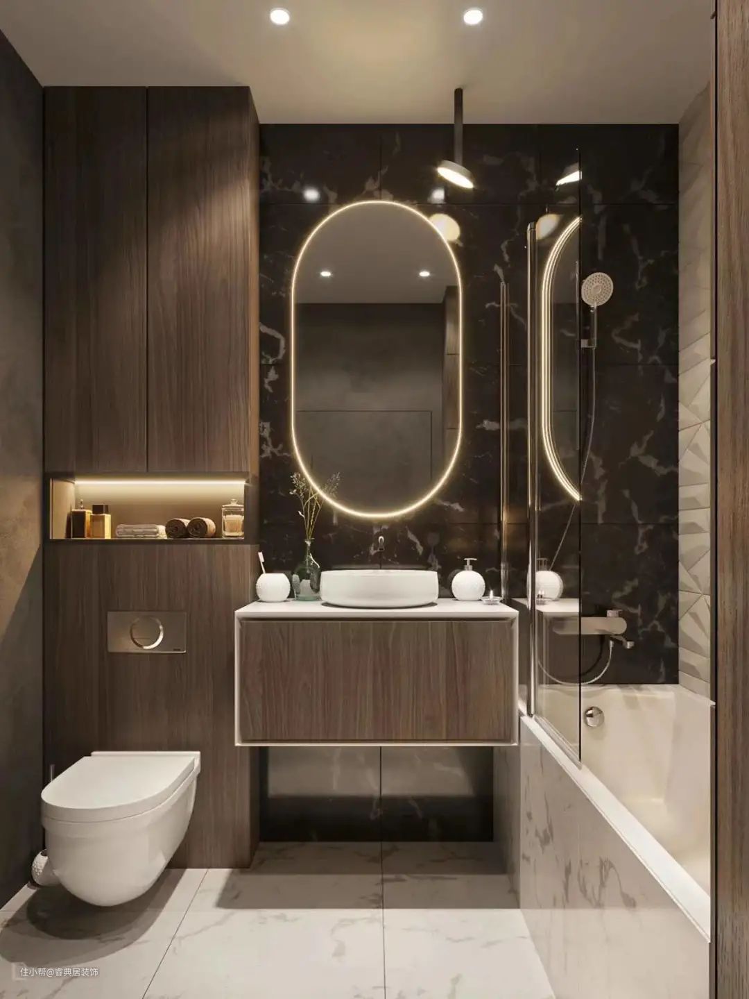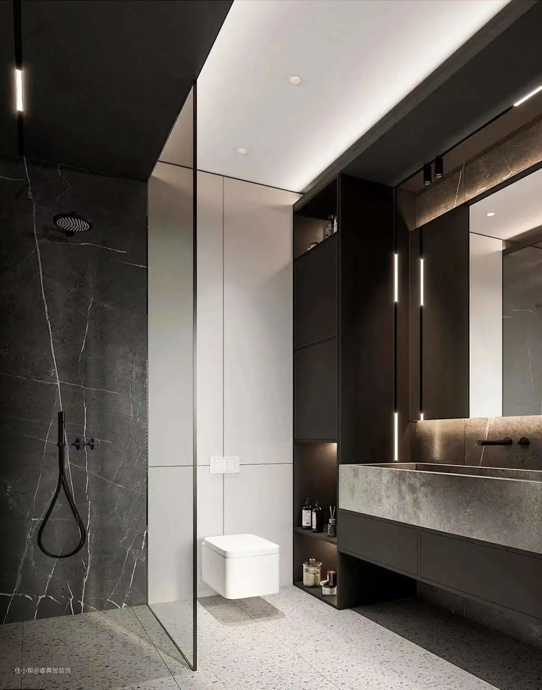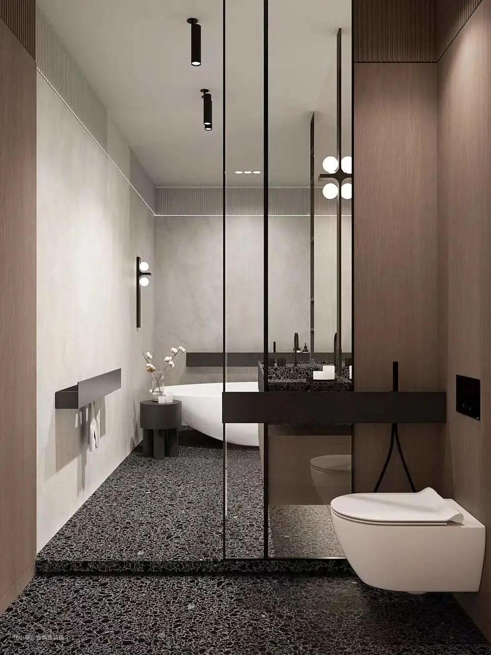 卫生间更注重的是实用性,在满足实用性的基础上进行一些个性化的搭配,一般以简洁大气为主,色彩和种类不要超过3种,反之会引起视觉上的审美疲劳,破坏这种色彩间的有机平衡。