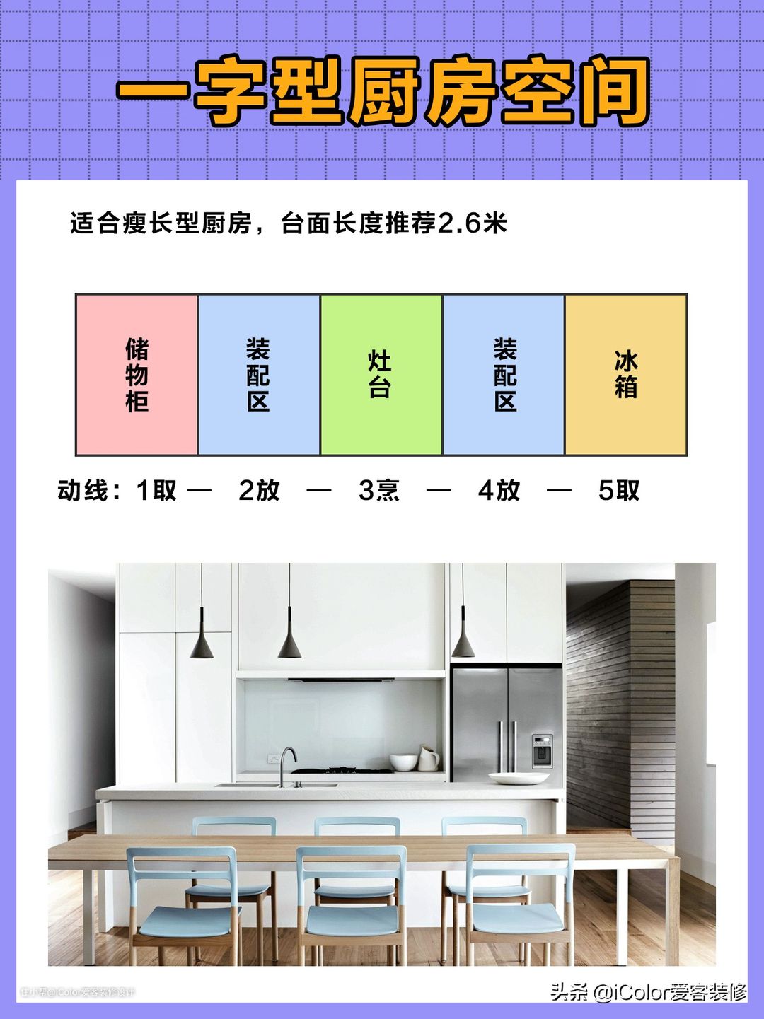 常见的厨房布局主要有“I”型、“II”型、“L”型、“U”型四种。我们来看看这四种厨房各个功能区到底怎么规划。