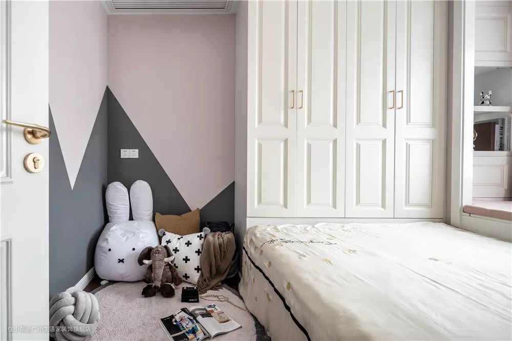 儿童房做了榻榻米床组合衣柜的设计,把床靠着飘窗,显得更为宽敞一些。儿童房内以粉色为主,搭配白色的家具看起来更加浪漫和优雅。