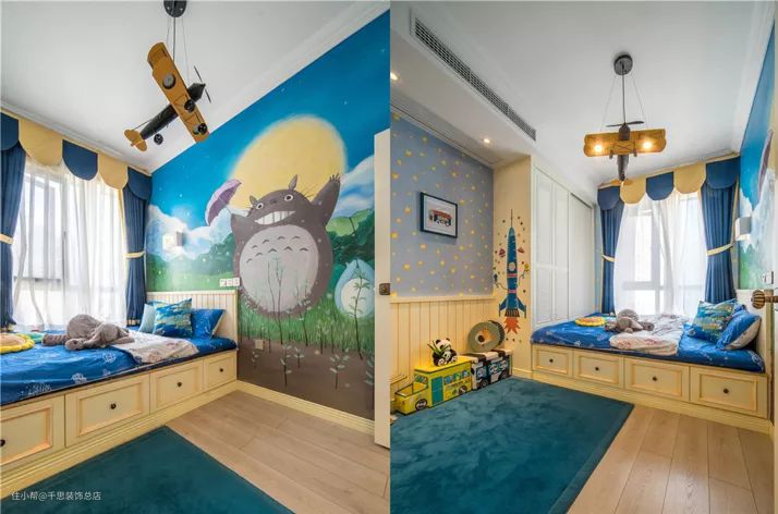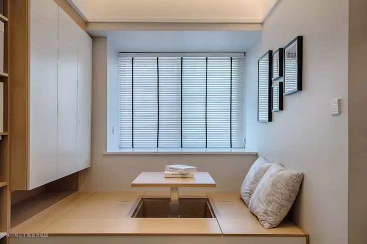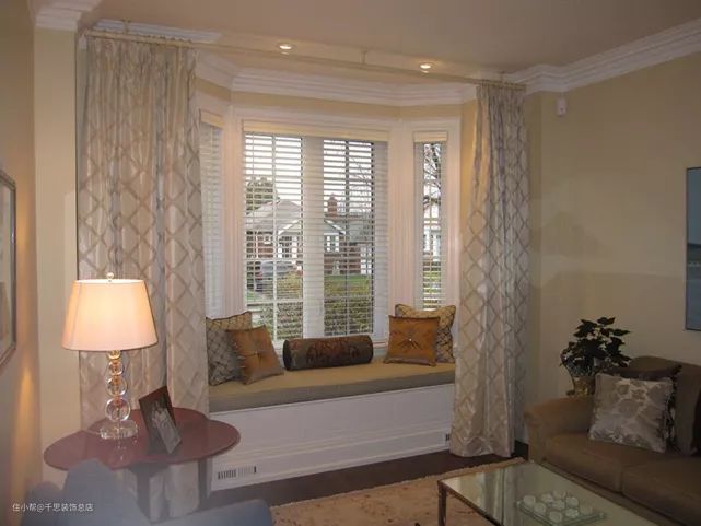 飘窗可以采用百叶帘+布帘组合的方式,百叶帘屏蔽室外刺眼的光线,夏季时坐在飘窗上喝着凉茶翻着书,那感觉简直不要太爽。再配上加厚遮光布帘,则能更好的保证睡眠效果。