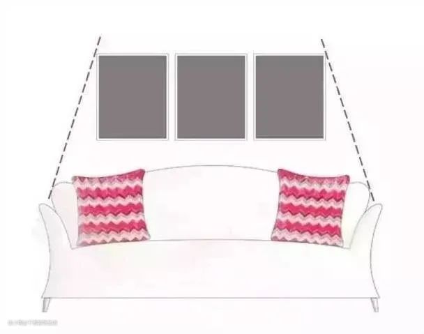◆梯形线能够让整体画面布局具有稳定感,不会出现头重脚轻的状况。以沙发为参照物,建议挂画的组合长度取沙发总长的黄金比例0.68,即挂画总长度=沙发总长度x0.68。
