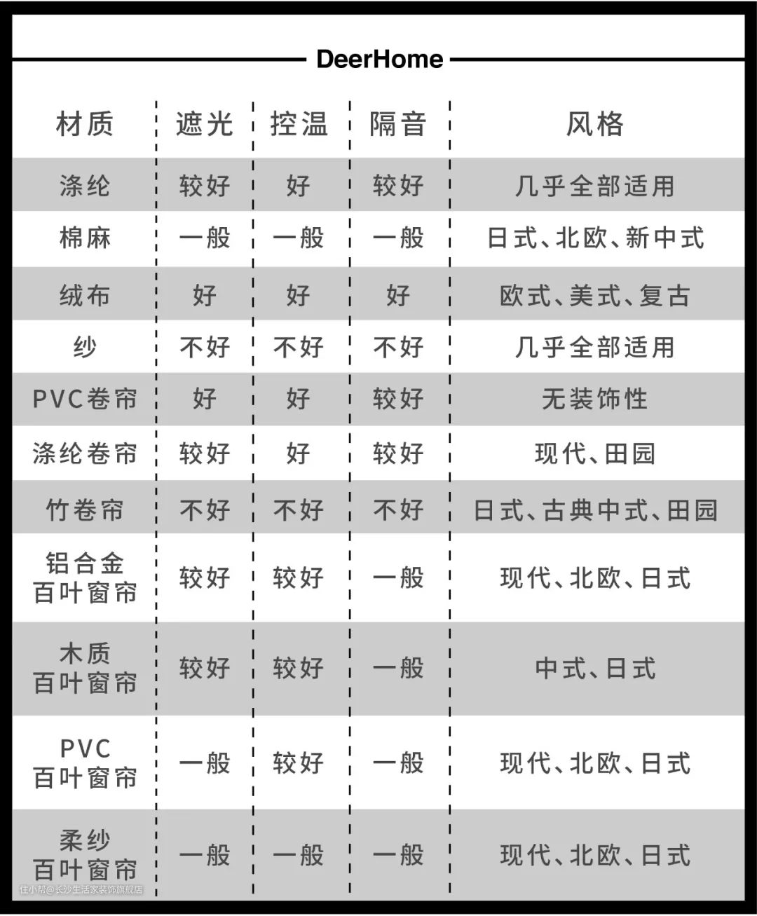看上面这一张总结图可以了解不同形态、材质窗帘的在功能上的优缺点,以及适合的风格。