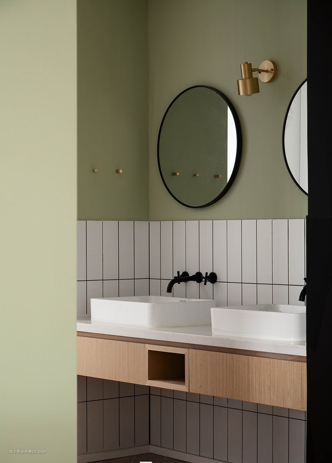 将墙面等分上色,也很符合现下复古风,两种颜色搭配既不单调,又不花哨,为整个空间构建出一种鲜明的对称美。