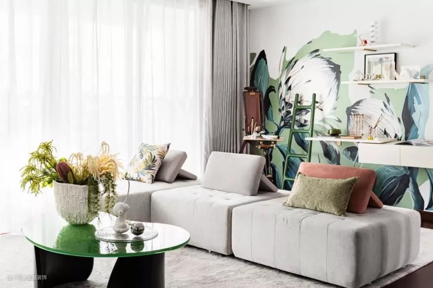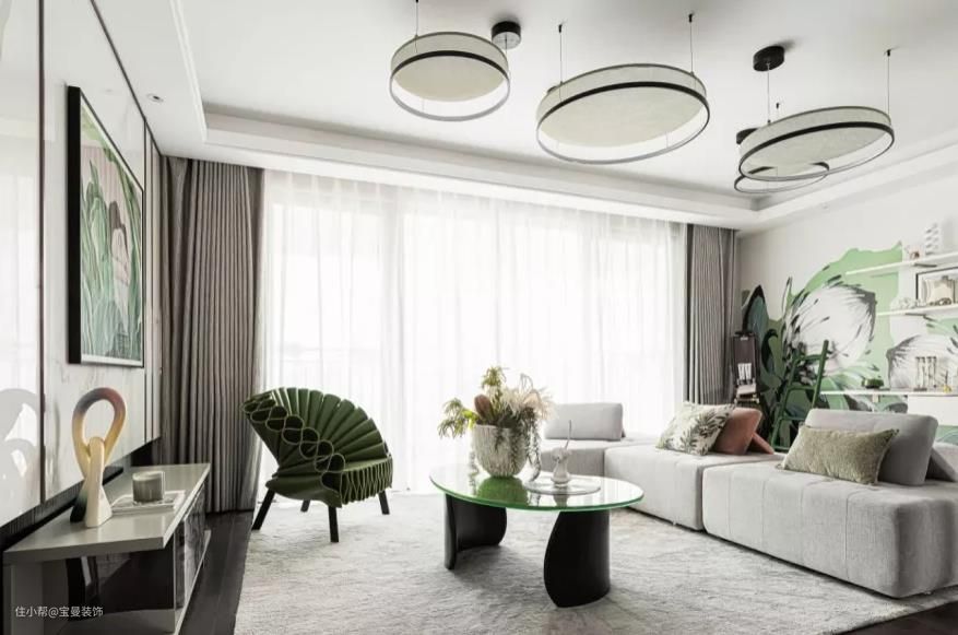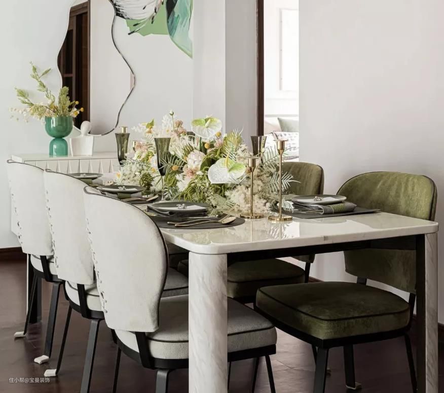 层层叠叠的绿是客餐厅的色彩主旋律,沙发后的植物手绘墙与对面的植物主题挂画遥相呼应。阔大的落地窗犹如取景框,太阳的东升西落调节着室内的光影氛围,若隐若现的白色纱帘引入大量光线与自然风景,使人舒适地体会到自然的节奏。