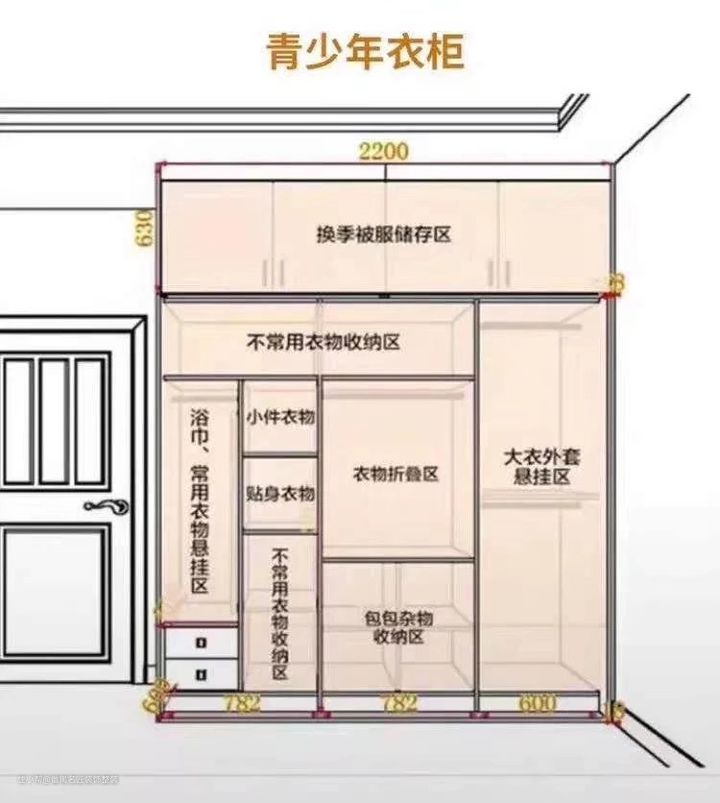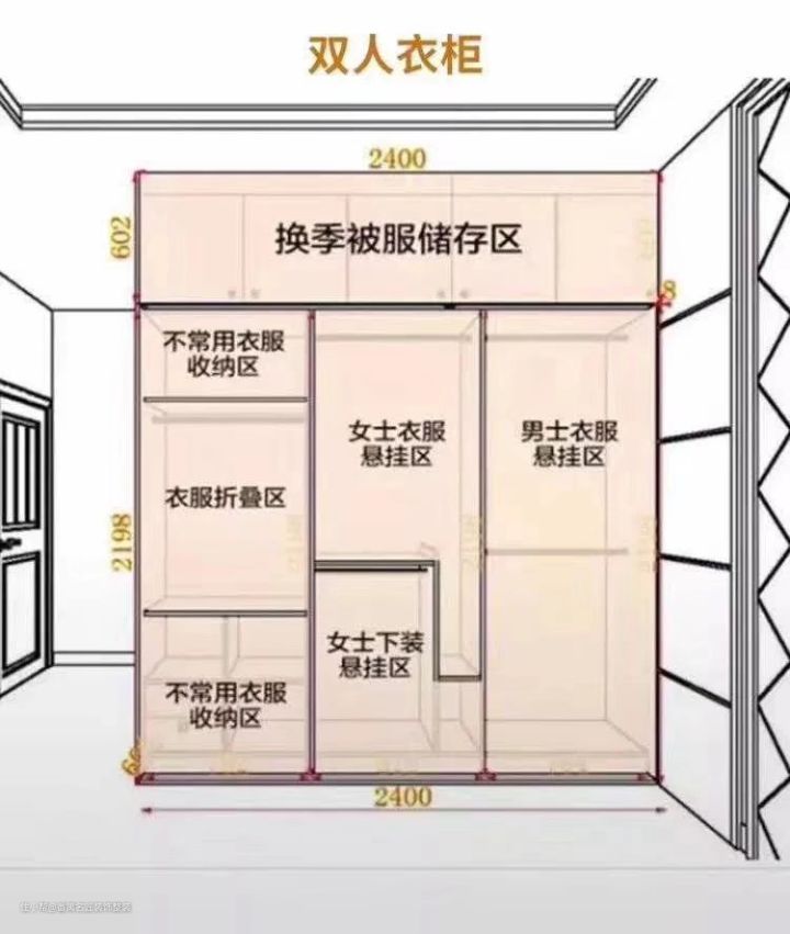 衣柜高:衣柜尽量做到顶,这样可以把顶部空间都利用起来,增加收纳空间,好看实用!如果没有吊顶,可以做到2600-2800mm。