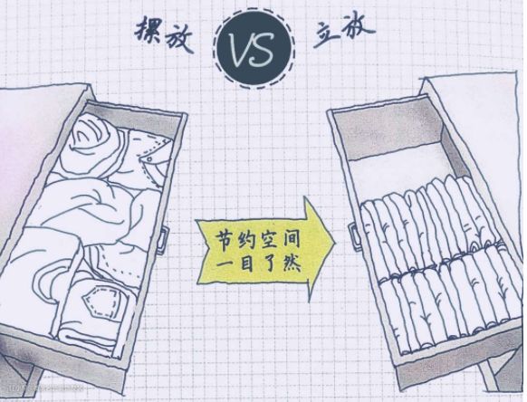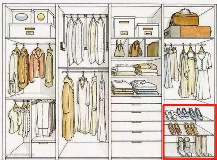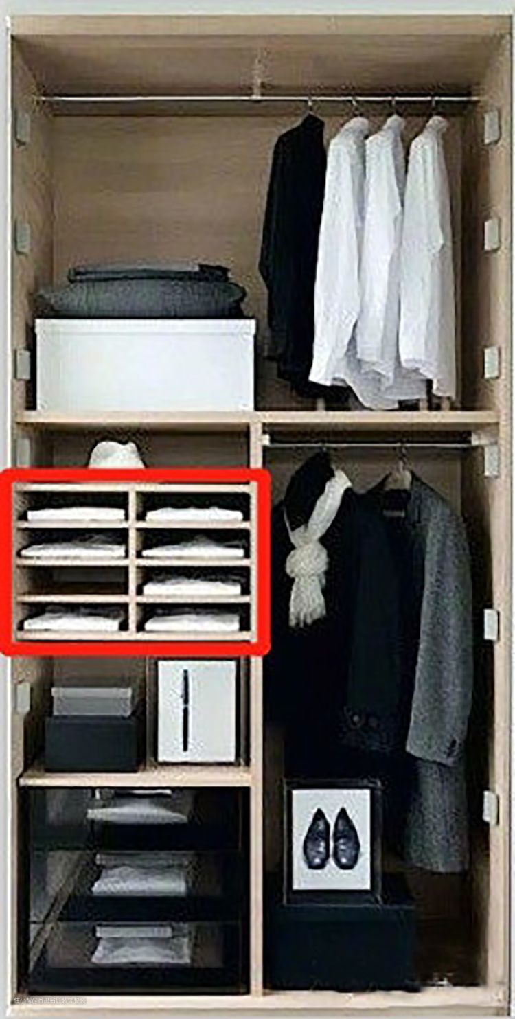 下边再搭配上大抽屉,注意抽屉一定要利用好,要让衣服“立式摆放,节约空间。