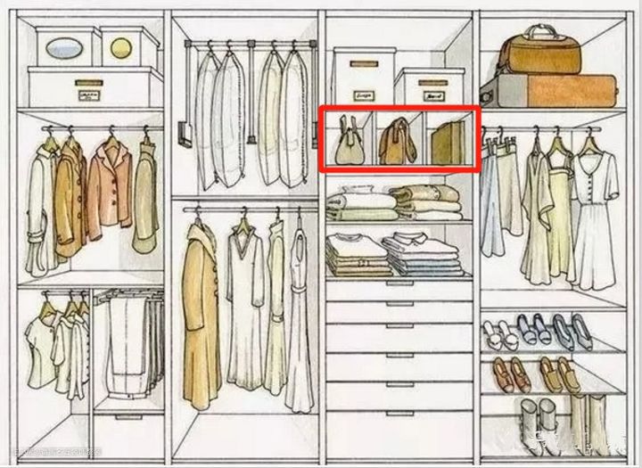 上图红框中放置包包的部分,中间隔断纯属是画!蛇!添!足!的作用,这样很可能导致其中一格放置一个包包过于富余,两个包包又放不下的情况。