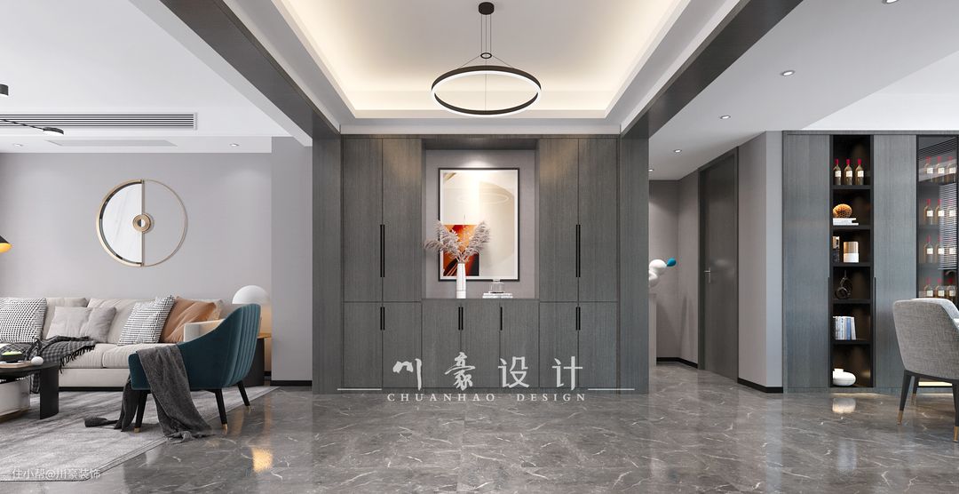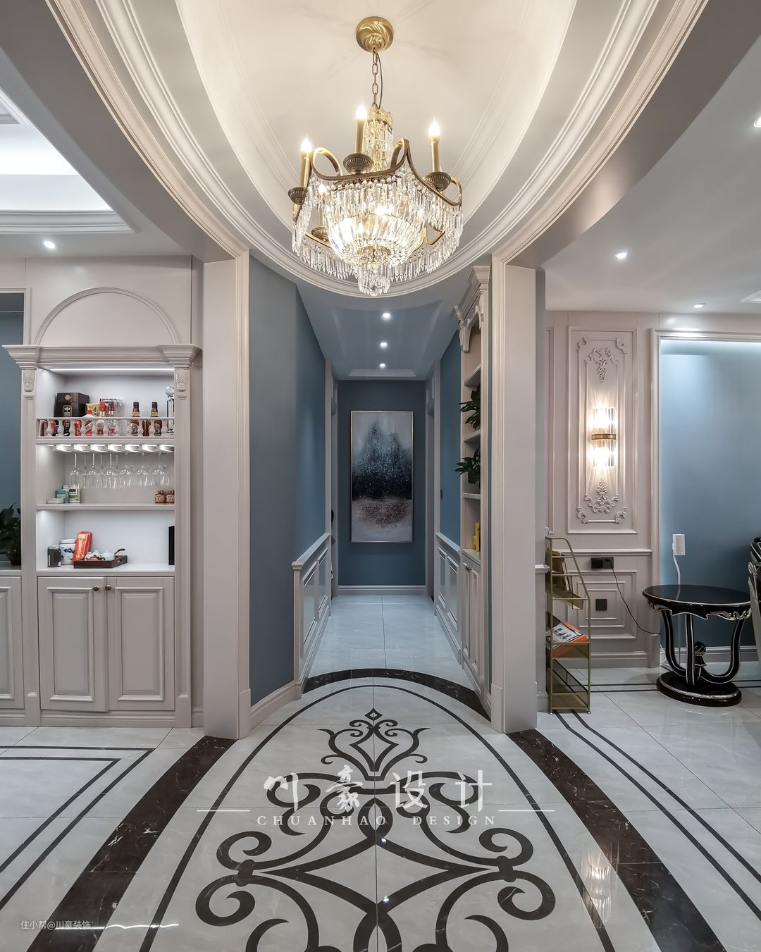 宽敞的走道可以适度的做一些复杂的吊顶造型,搭配自家装修风格,不仅能增添设计感,还能将顶部的横梁或线条藏起来,使空间保证整体与统一。