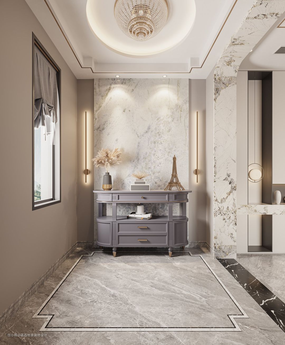 入户是一个独立的空间,做了一个端景设计,让入户的一瞬间,就能让人感受到空间的精美与优雅、