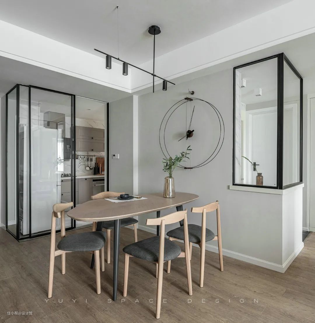 ▲餐厅背景墙后方是过道空间+卫浴洗手盆区,加入了矮墙与玻璃隔墙的设计,在分隔空间的同时也让空间显得更加明亮。