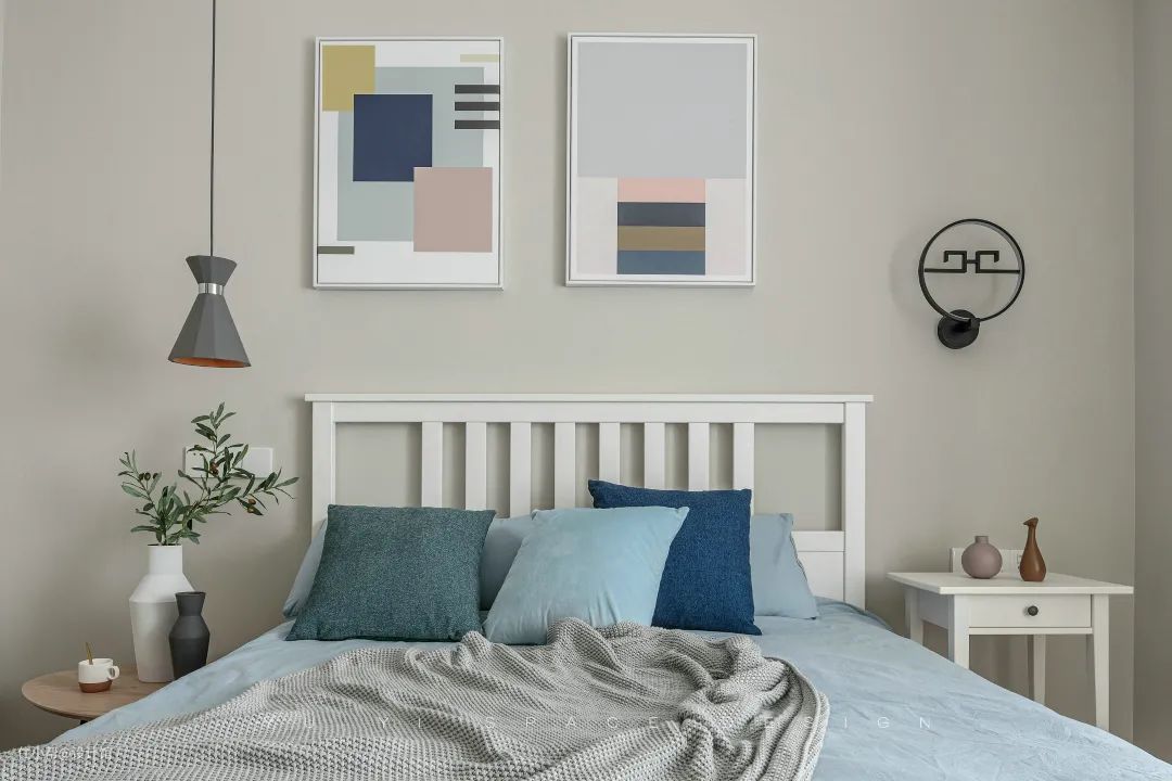 ▲儿童房也是以咖灰色的墙面,布置象牙白的实木床与床头柜,床头墙挂上几何色彩图案的装饰画,两侧床头柜布置上花瓶,再铺设蓝色的床单,整个空间都显得格外的清新。