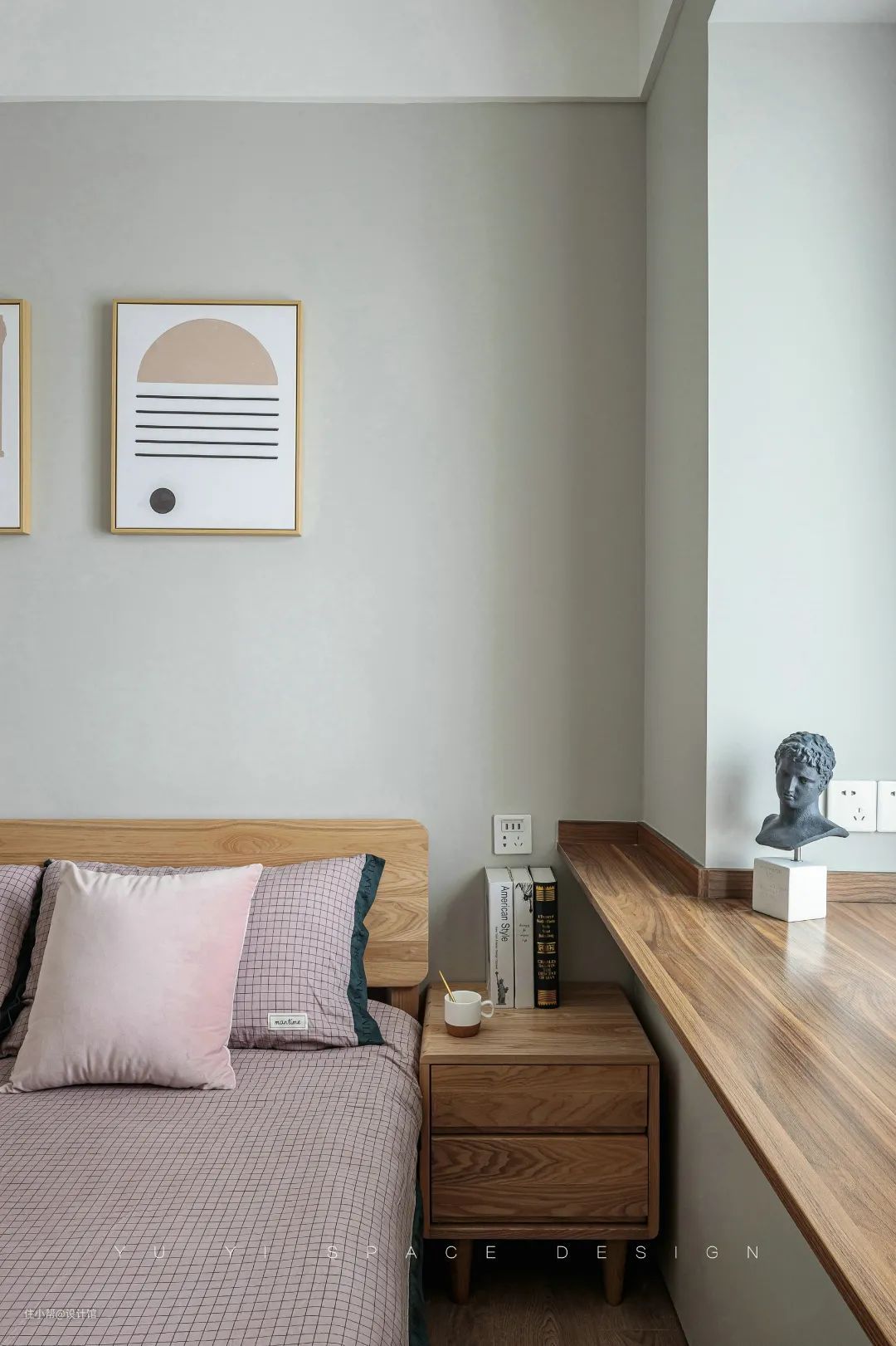 ▲简易的托盘床头柜上,摆上黑白配的花瓶,还有一个小茶杯,上方一张灰色灯罩的床头吊灯,带来一种简洁优雅的艺术感。