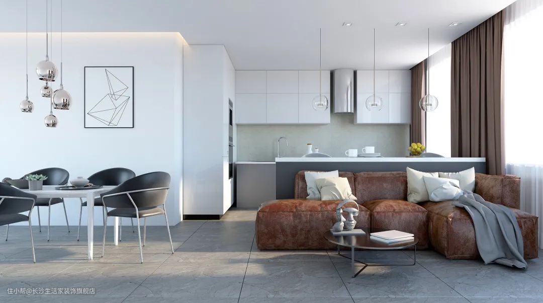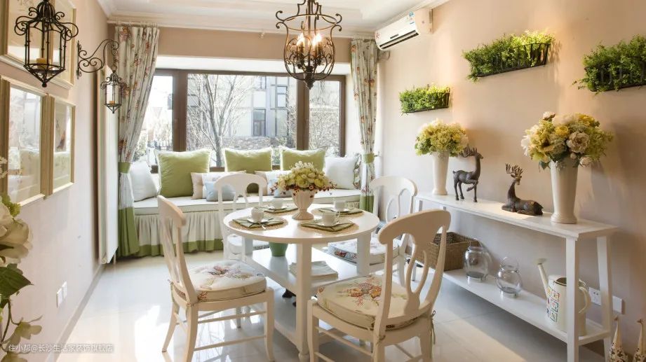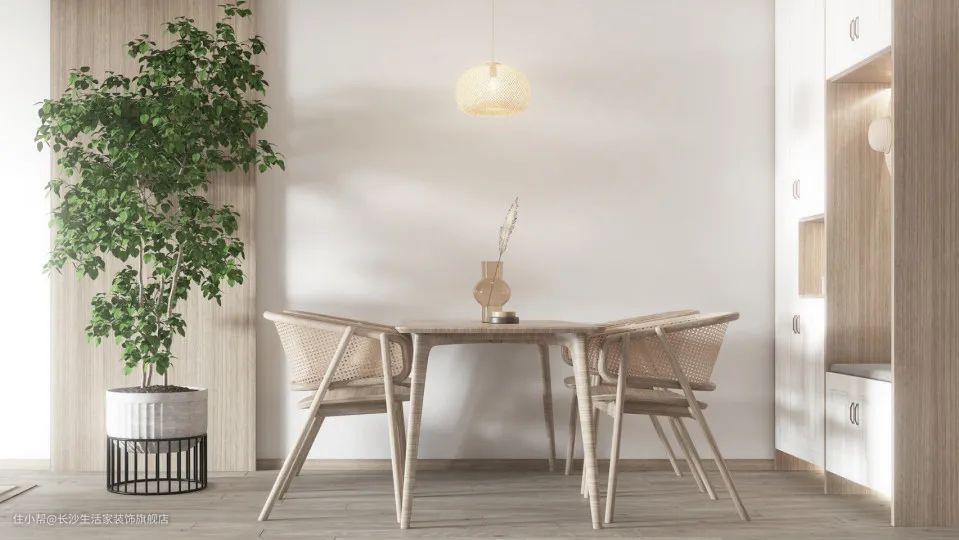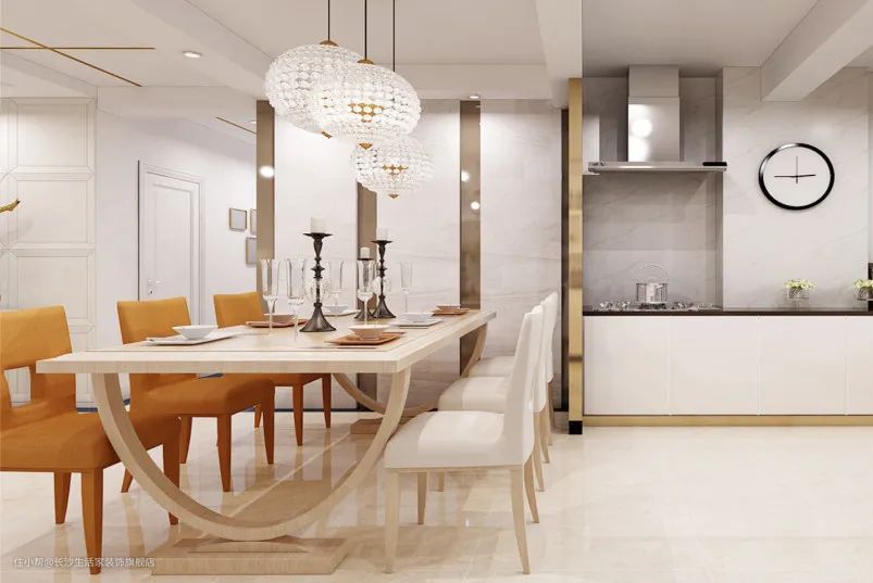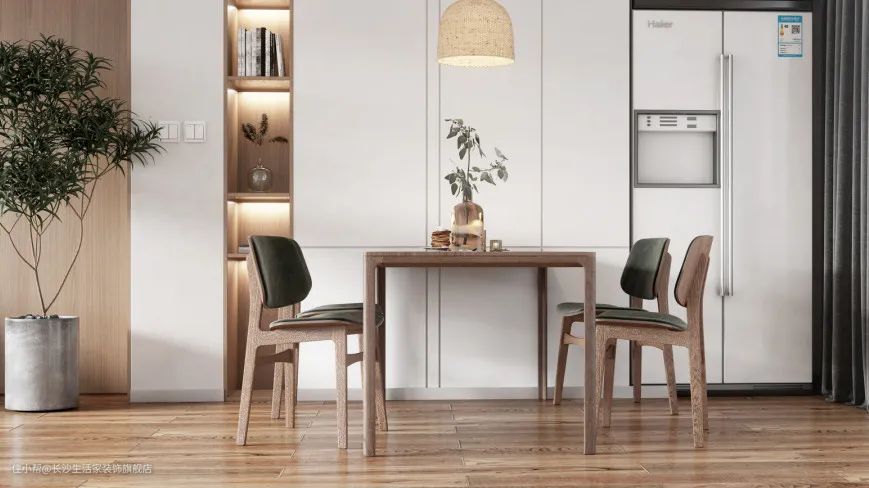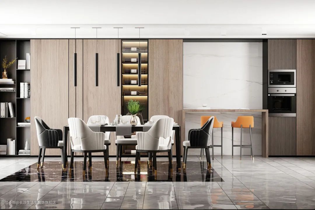 除此之外,为了保证餐厅空间的舒适性,建议餐桌与墙面留80cm左右,餐桌与过道保持1m以上距离,尽量选择大一点的餐桌,满足用餐需求。