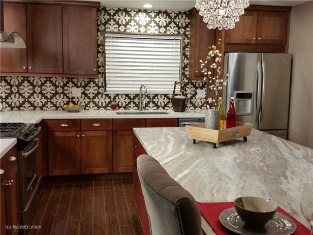丰富的图案后挡板令人惊叹,但它的暖色调与木橱柜和地板巧妙融合。