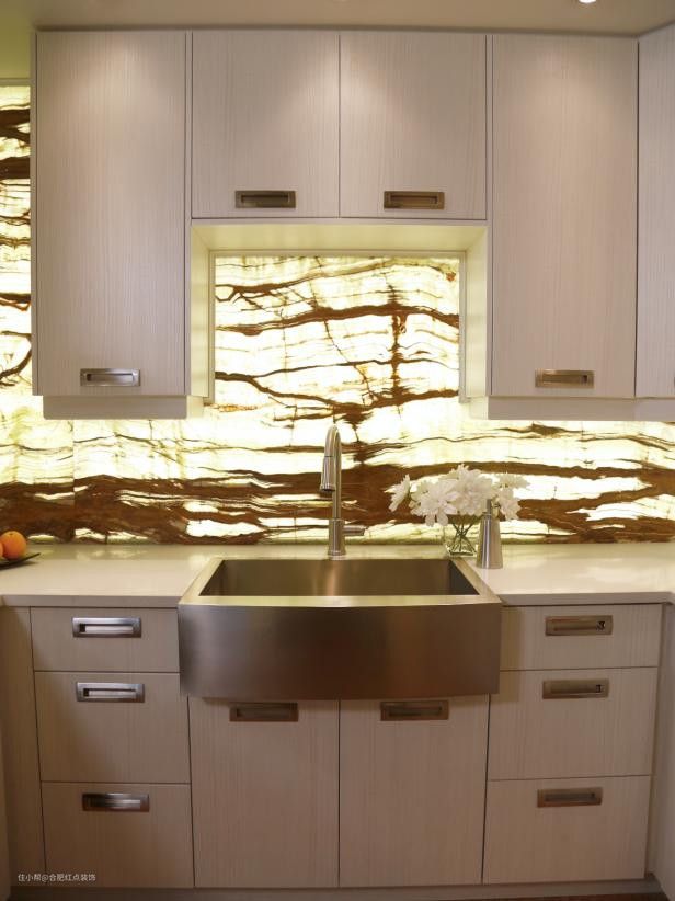 缟玛瑙背光板成为这个现代厨房的抢眼焦点。