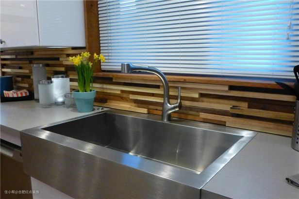 后挡板可能看起来像高端瓷砖,但实际上是染有四种不同颜色的木板条。