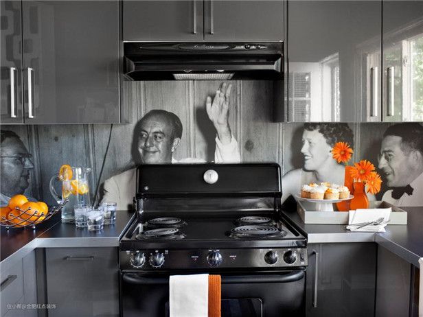 布赖恩·帕特里克·弗林 (Brian Patrick Flynn) 设计了这个带有灰色高光橱柜和由黑白照片制成的前沿后挡板的现代厨房。橙色点缀使单色调色板更加明亮。
