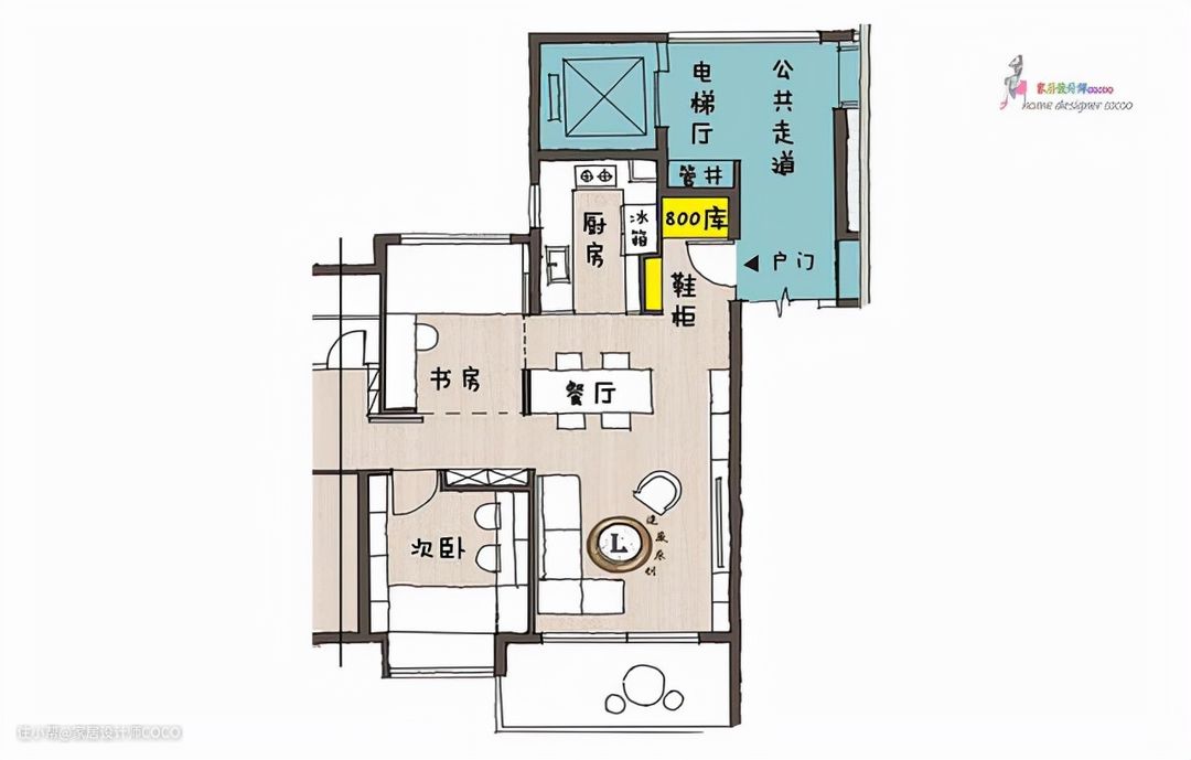 类似这种入户有一块空置区域的户型,就可以利用"800库"的设计手法,来做一个玄关区。