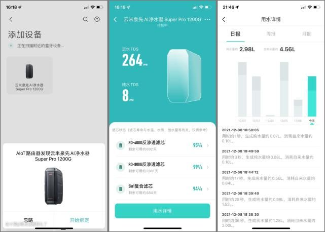 ▲还是以云米Super Pro 1200G为例。首先在外观上,黑色的水龙头,自带屏幕可以显示净水状态(没有TDS值是个遗憾),先不说好不好看,起码观感上很高级啊。实用之处在于,可以连接米家APP,在手机上查看净水器的水质状态、滤芯寿命和用水量,看到RO800G还可以用2800多天,心里像手里有钱家里有粮一样一点不慌啊。